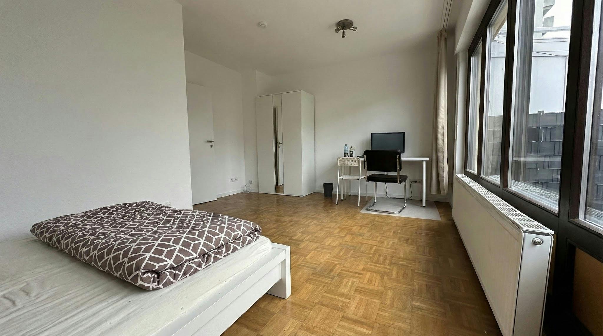 The room is furnished with a large bed (140 x 200 cm) incl. mattress, a large wardrobe, a desk and a chair as well as a floor protection mat. The room can be redecorated as desired.