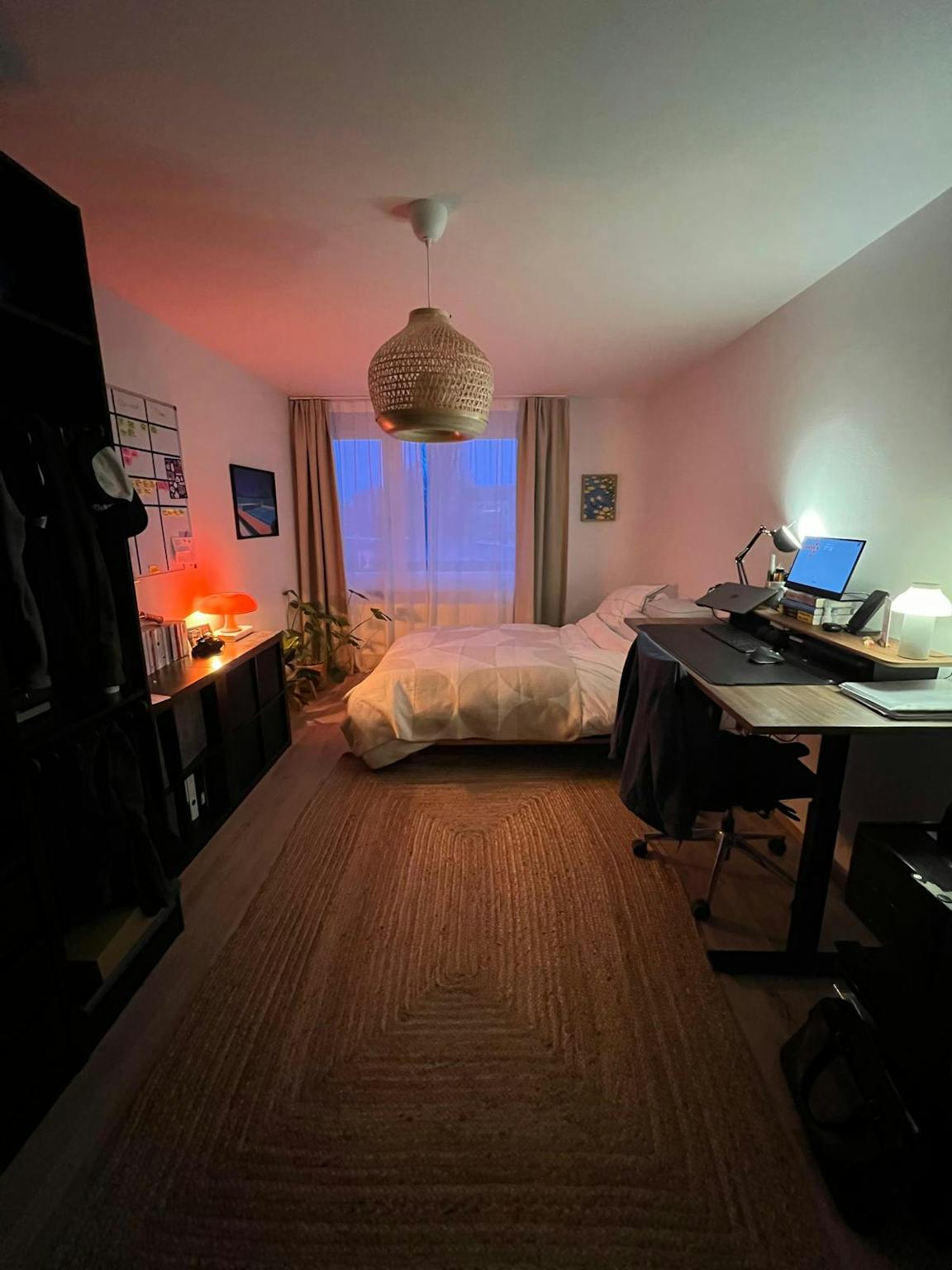 Die Wohnung verfügt über ein großzügiges Schlafzimmer mit Bett, höhenverstellbarem Schreibtisch und geräumigem Kleiderschrank sowie ein Wohnzimmer mit Couch, Esstisch und Fernseher.