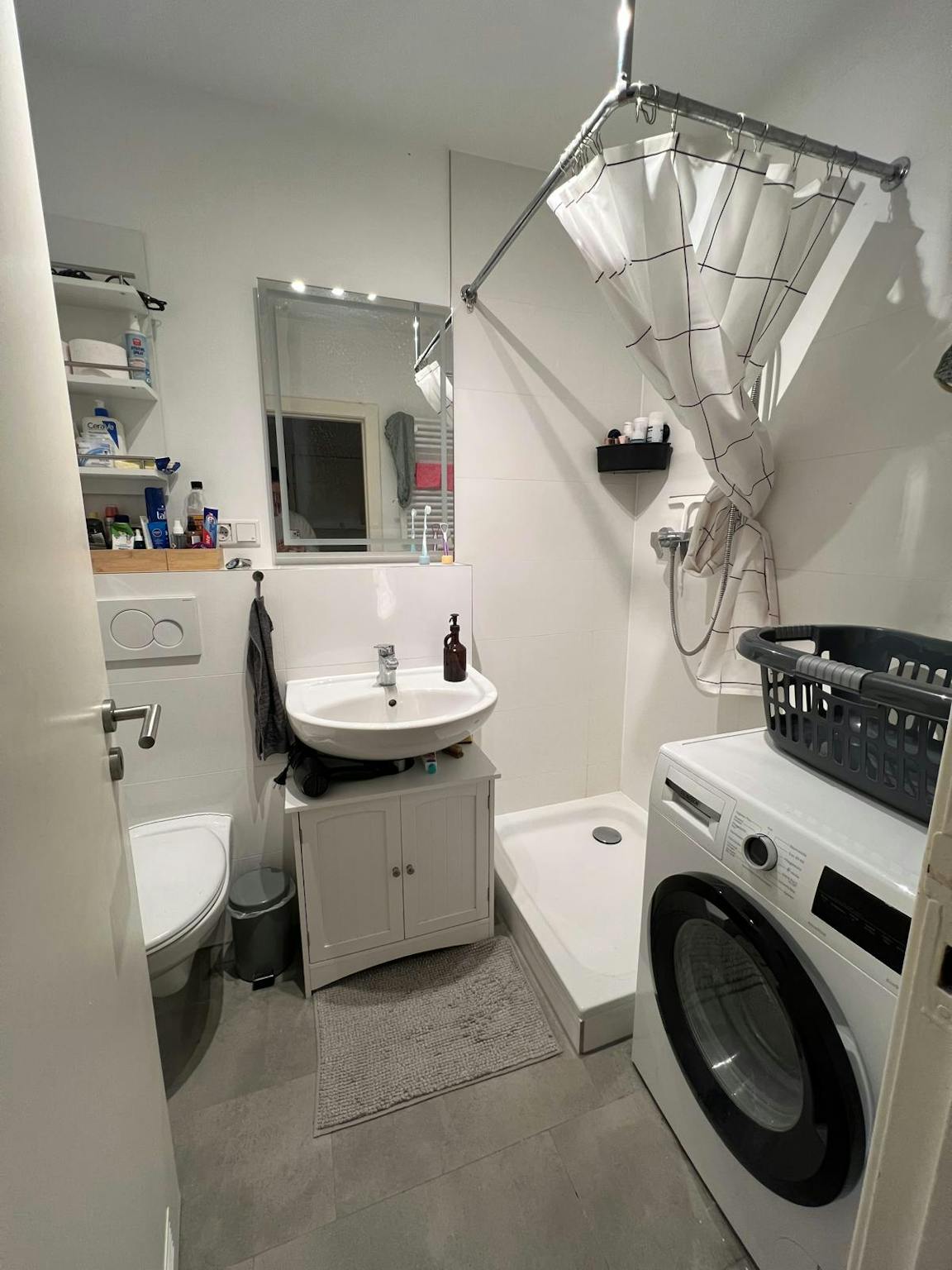 Das Bad ist modern und verfügt über Dusche, Toilette sowie eine Waschmaschine.