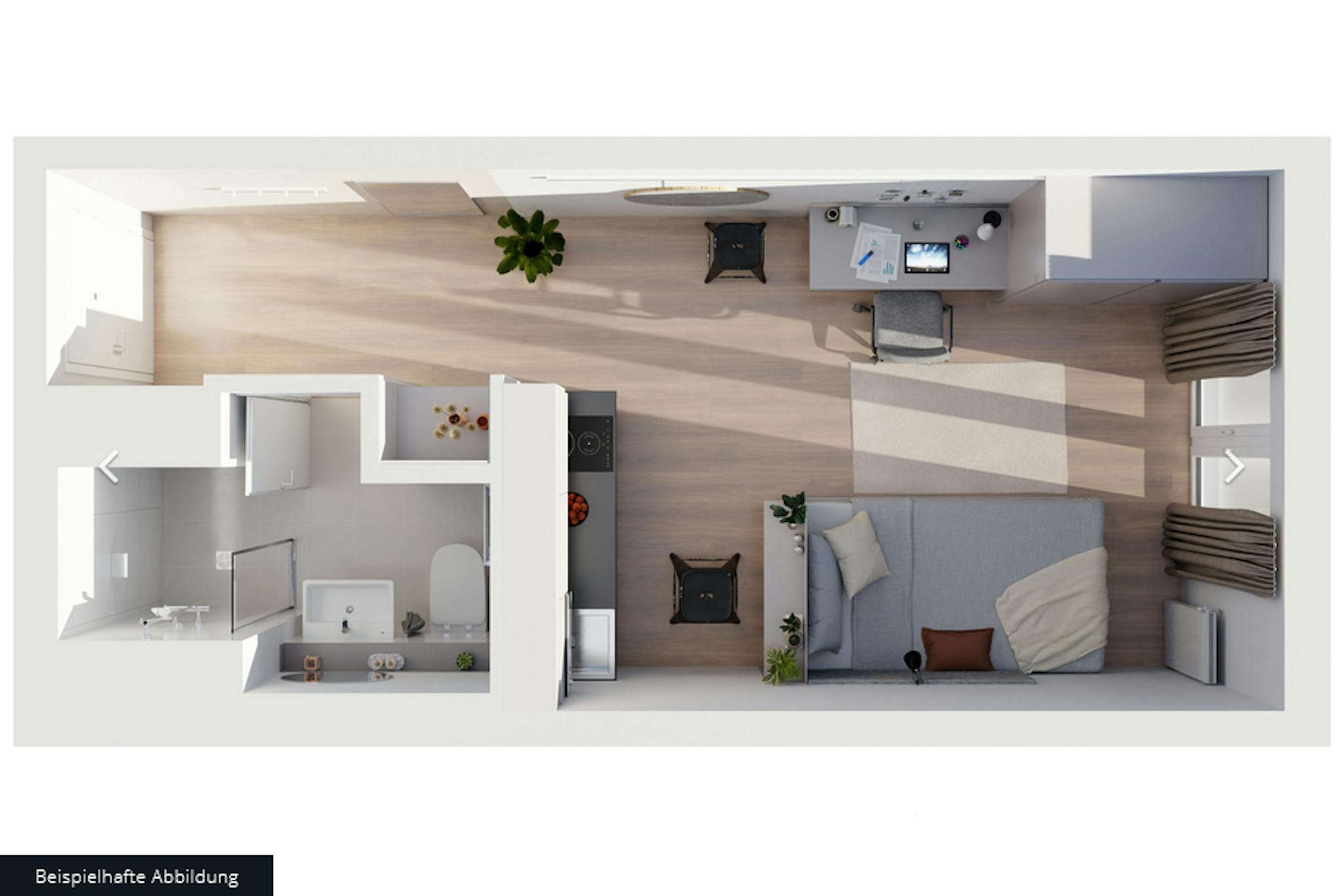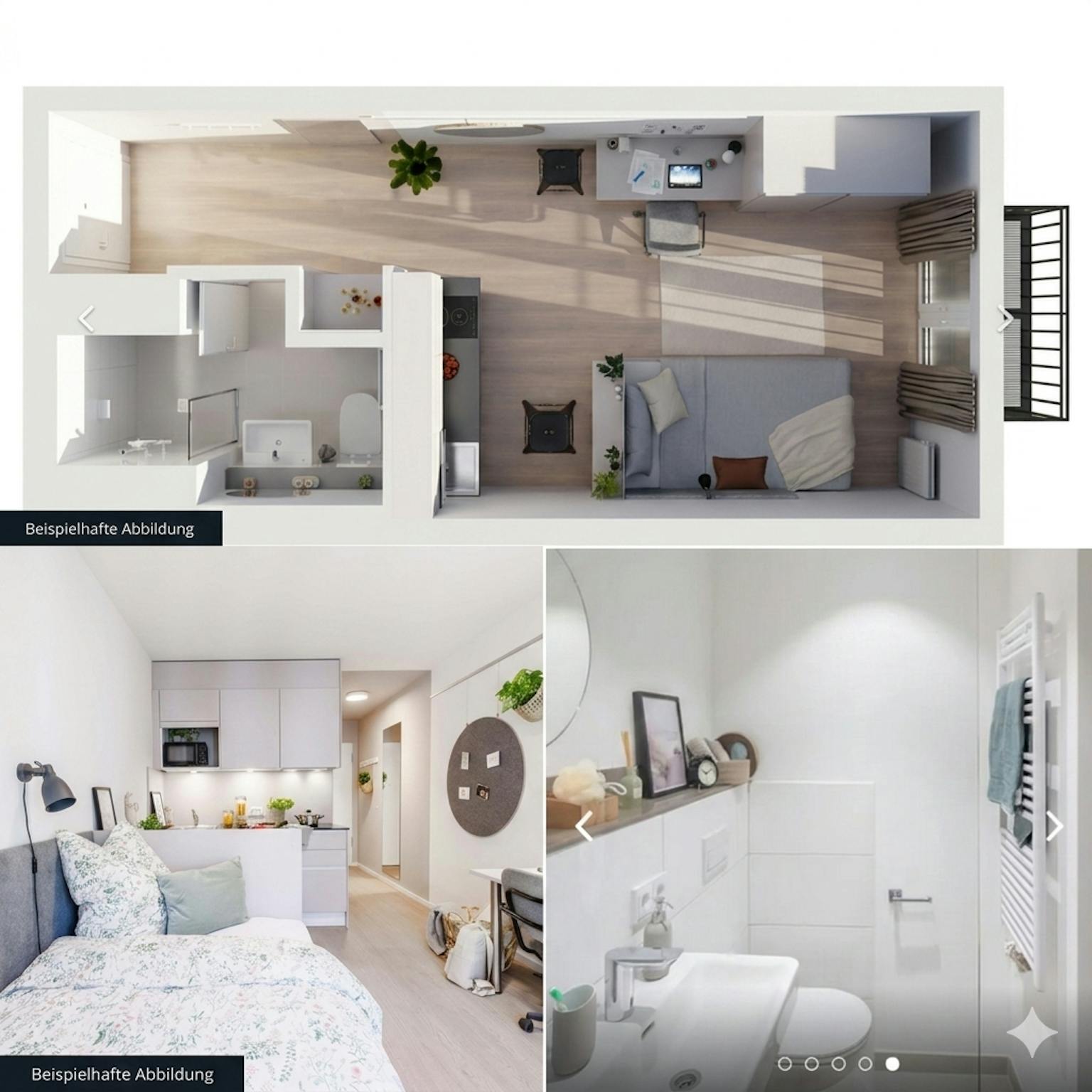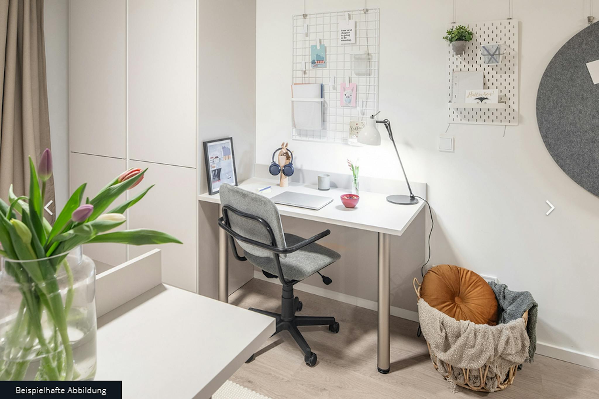 Dein Apartment ist ein echtes Raumwunder: Es verfügt über ein gemütliches 120x200 Bett, einen großen Schreibtisch für produktive Sessions, einen bequemen Sessel zum Entspannen und einen eigenen Essbereich. Die moderne Pantry-Küche ist mit Herd und Mikrowellenherd voll ausgestattet. Ein privates Duschbad, Highspeed-WLAN und ein sonniger Balkon runden dein Zuhause ab.