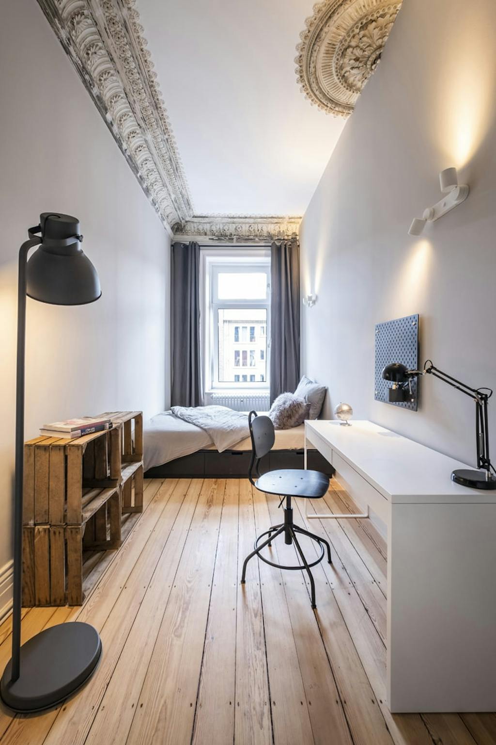 Dieses Zimmer ist bereits möbliert und mit Bett, Schrank, Schreibtisch & Co. ausgestattet. Sogar die Vorhänge sind angebracht.
