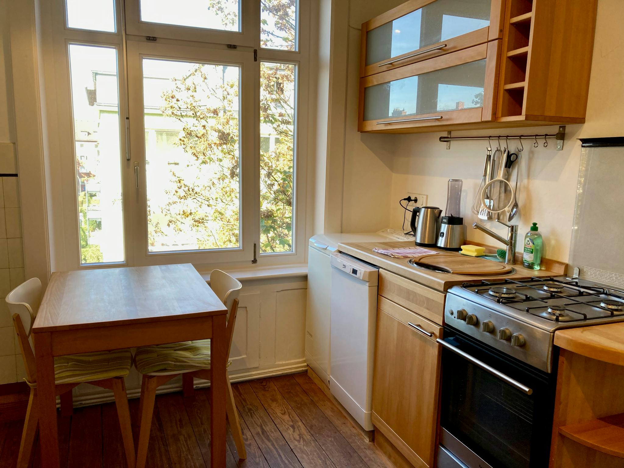 Die Wohnung verfügt über ein Wohnzimmer mit Arbeitsplatz, ein Schlafzimmer, Küche mit Esstisch und Badezimmer mit Badewanne auf ca. 50 qm. Sowohl am Wohnzimmer als auch am Schlafzimmer befindet sich ein Balkon. Die Küche ist voll ausgestattet mit Gasherd, Kühlschrank, Spülmaschine und Waschmaschine.