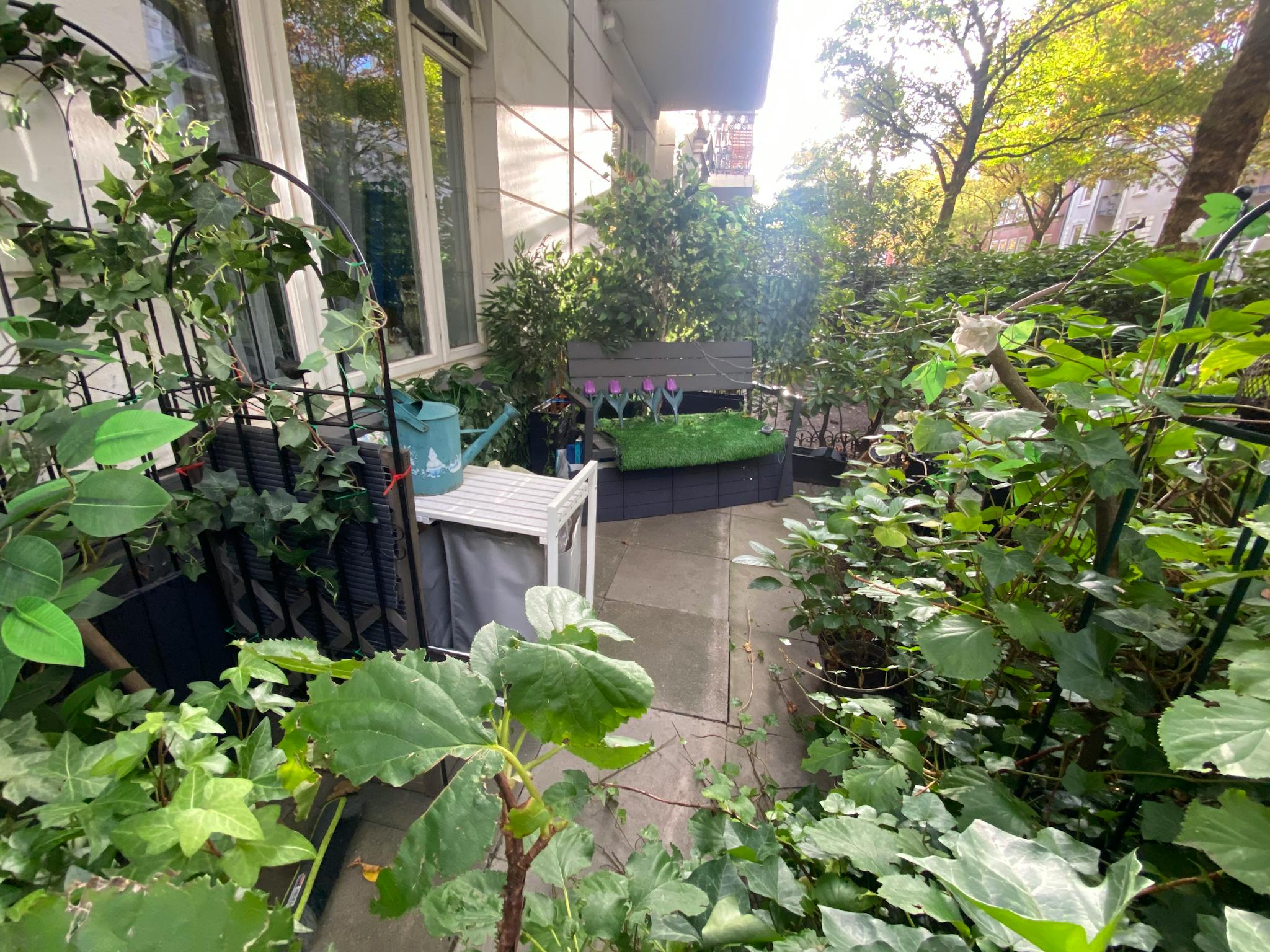 Das Gebäude selbst ist ein über 120 Jahre altes, denkmalgeschütztes Haus, das einen einzigartigen Mix aus historischem Charakter und modernem Komfort bietet. Die Wohnung verfügt über eine private Terrasse, die direkt an die Küche anschließt – ideal für den Morgenkaffee oder einen entspannten Abend – sowie über einen privaten Garten mit einer Sitzbank, der durch ein Außentor zugänglich ist. Diese grüne Oase bietet eine seltene Ruhe mitten in der Stadt.