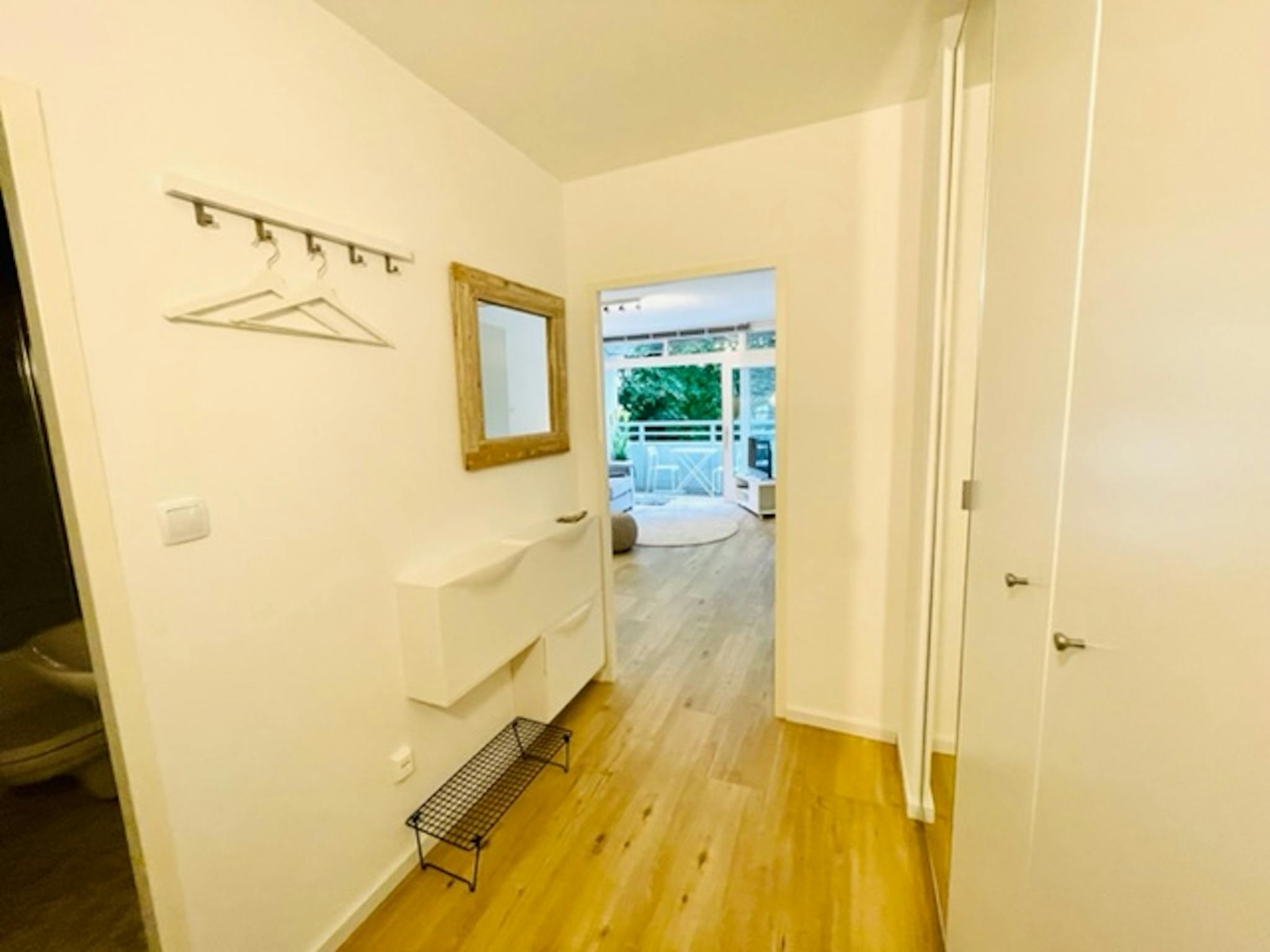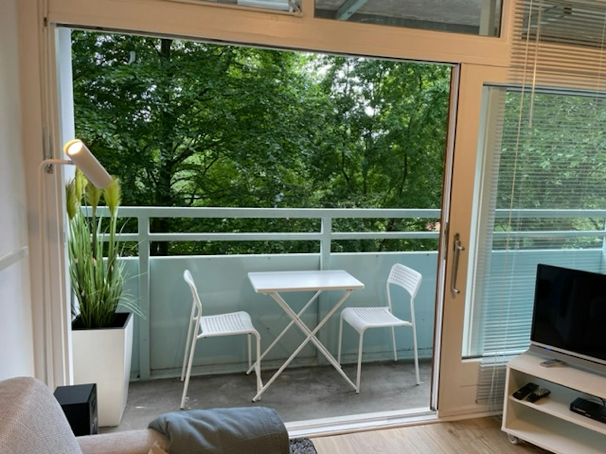 1-Room-Apt., appr 360sqft, 2.Floor, Elevator, completely modernised, Bath entirely new, kitchen modernized, 4-door-wardrobe, new laminate flooring, 43sqft Balkony facing west w. into the green, Fully furnished, Elevator, Cellar, non private Car park, Bicycle park, live-in Kitchen, Dishwasher, Bathtub with Shower, usage of pay washing mashine and tumbler in basement , TV, single bed (0,90m), bed sofa (bed 1,30m), Kitchen with ceramic hob, oven, hood, dishwasher, microwave, fridge, freezer, coffee mashine, water heater, Toaster, dishes glasses, cutlery, kitchen appliance, some kitchen towels, towels, 2 sets of bed linen