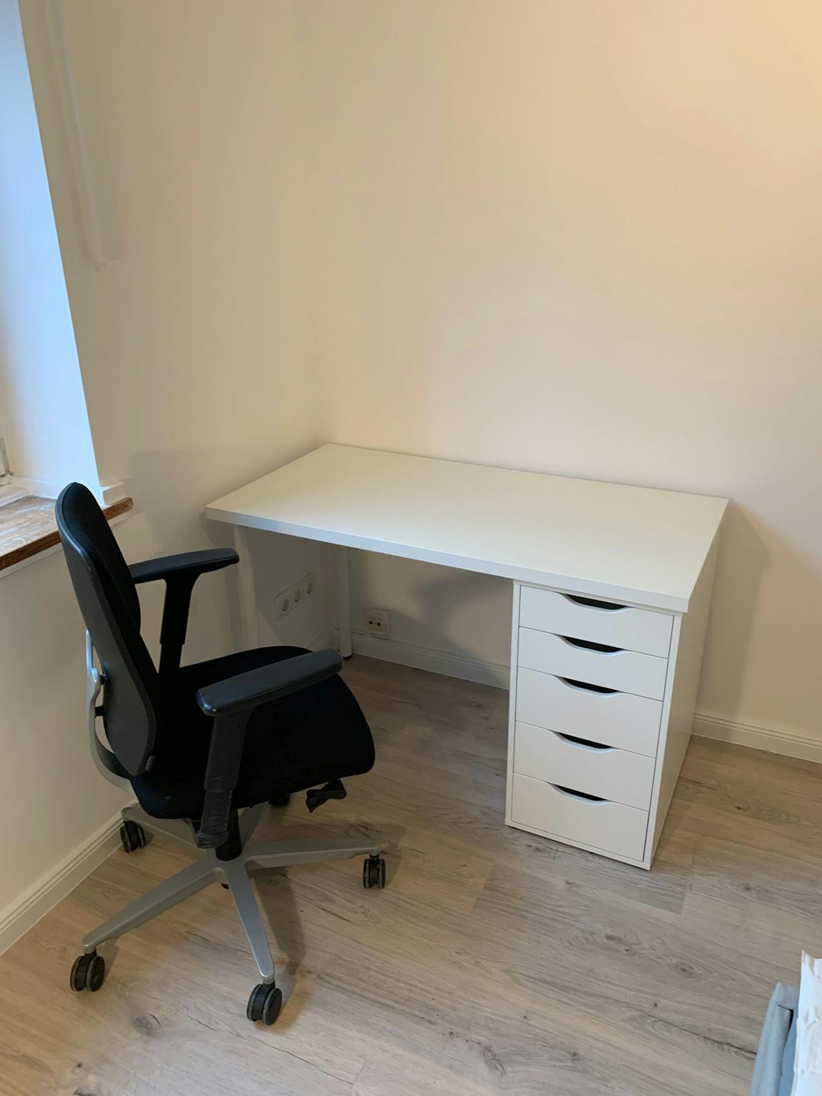 The apartment was renovated last summer 2022 and a new kitchen with induction hob was installed. Tableware and matching cookware and a microwave are part of the equipment. The room for rent was also renovated last summer and equipped with new furniture.