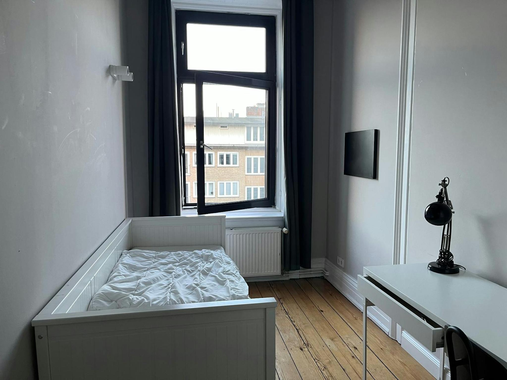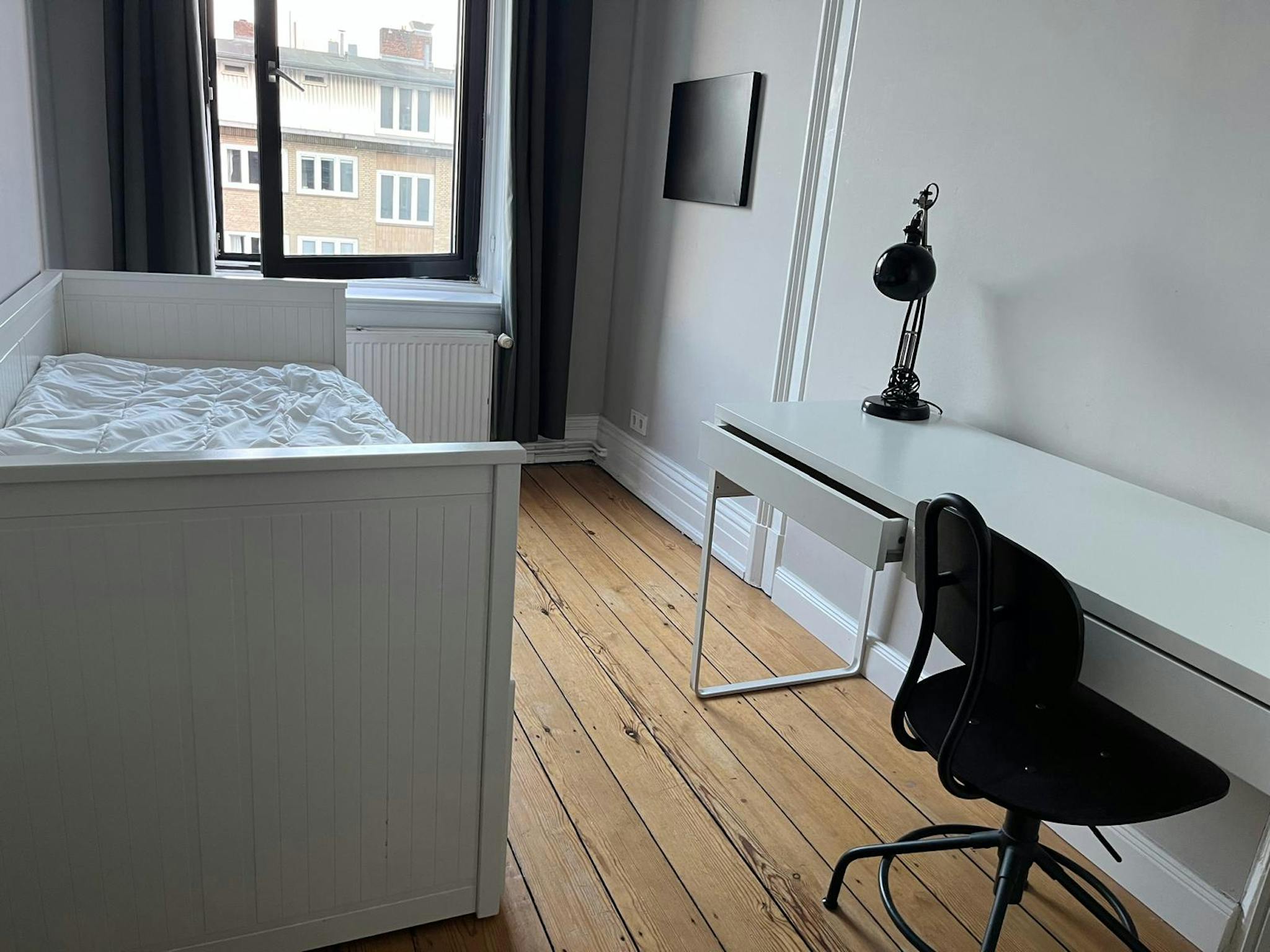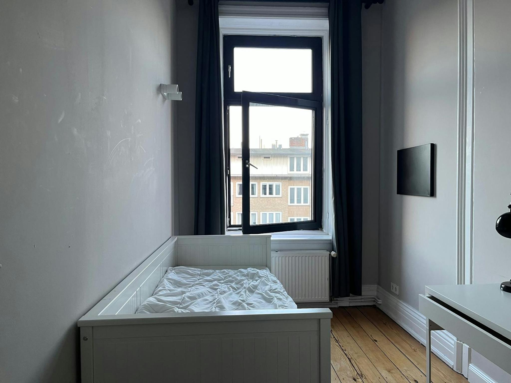 Dieses Zimmer ist bereits möbliert und mit Daybett, Schrank, Schreibtisch & Co. ausgestattet. Sogar die Vorhänge sind angebracht.