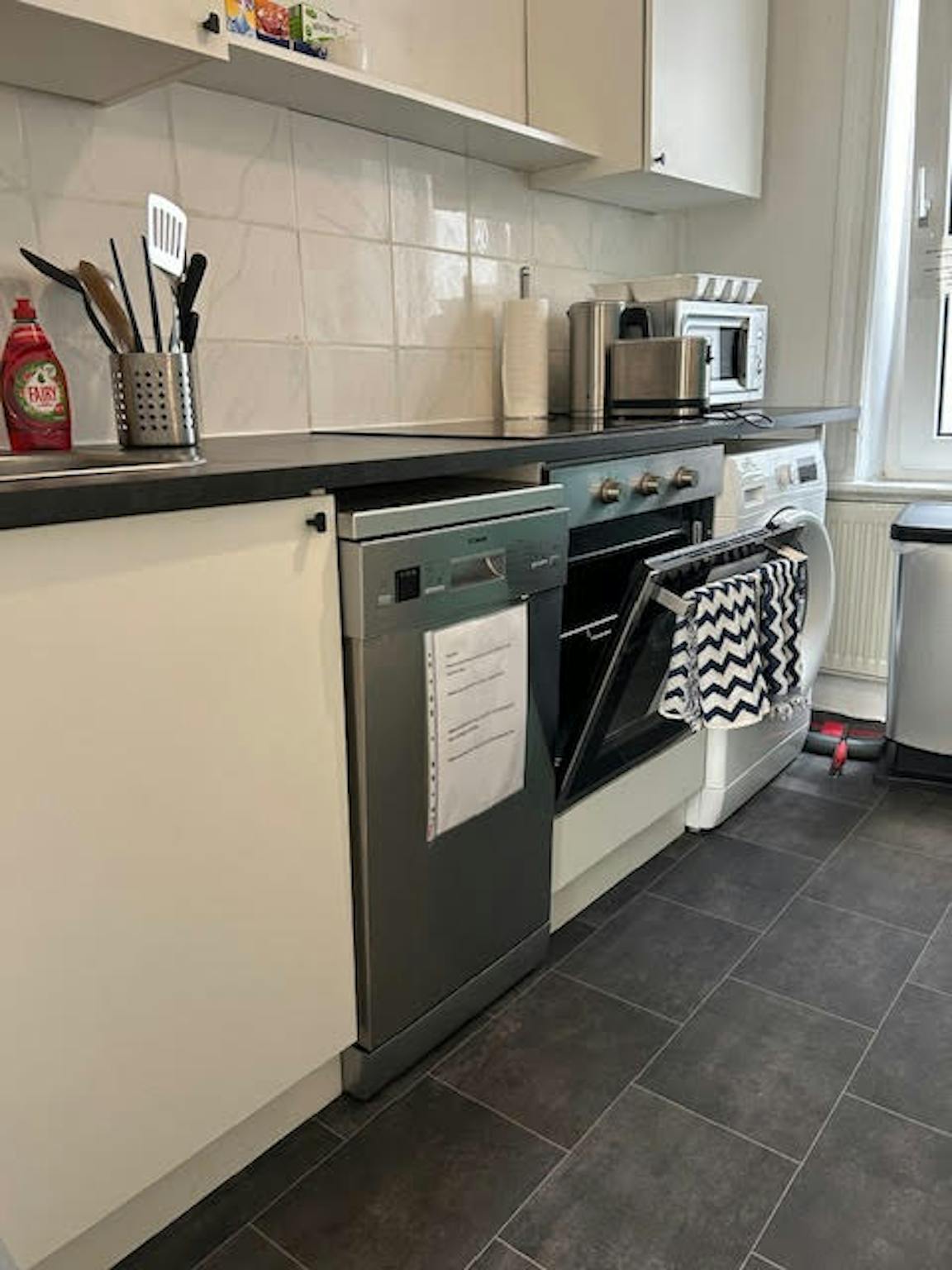 Küche sind ausgestattet mit nagelneue Einbauküche . Kühlschrank und Kühltruhe, kochfeld, Elektro-Backofen. Kaffeemaschine,(Normal mit Pulver), Wasserkocher und Geschirr. Besteck sind vorhanden. Einbauküche ist inklusive Waschmaschine und einen Geschirrspüler