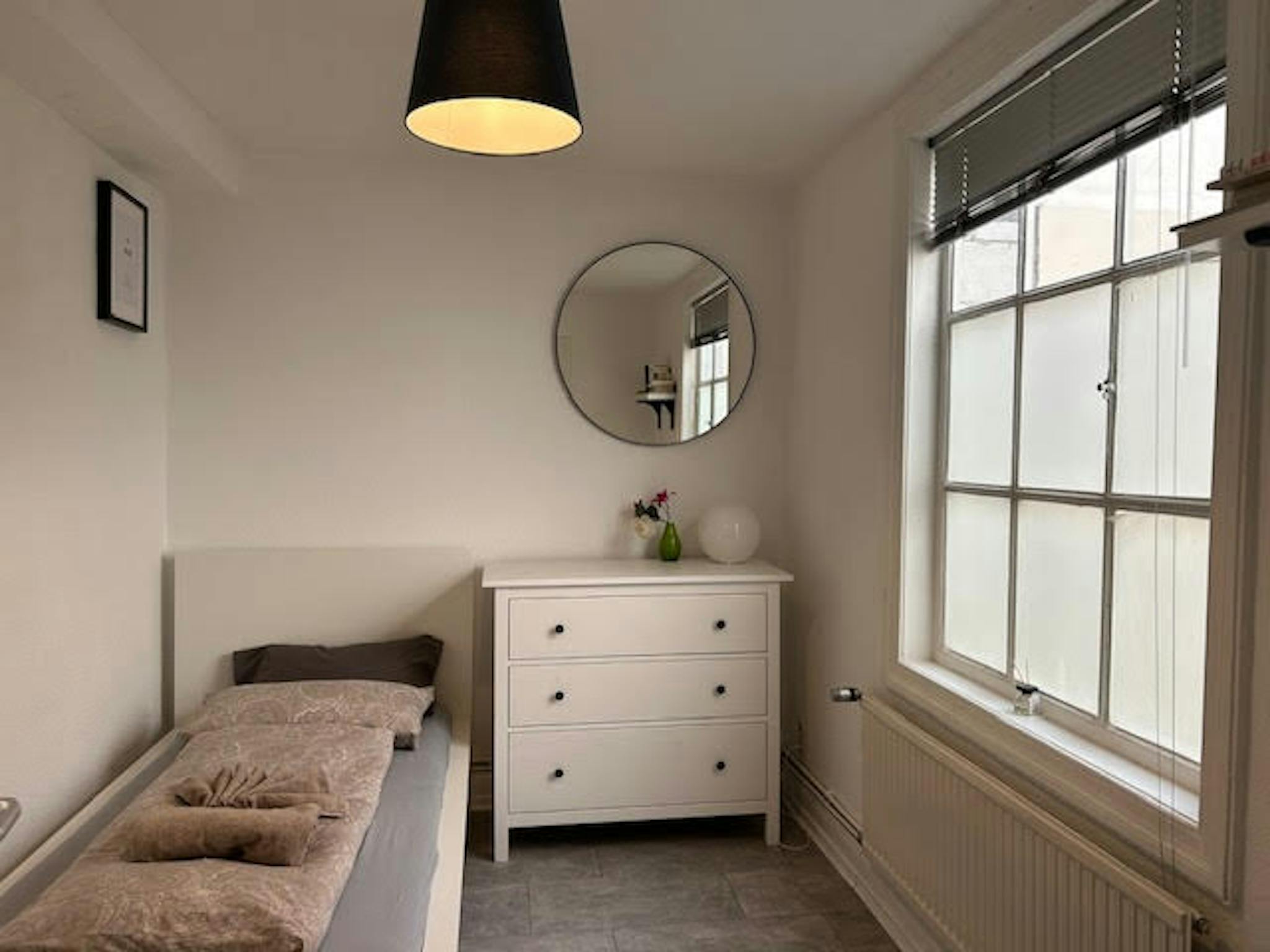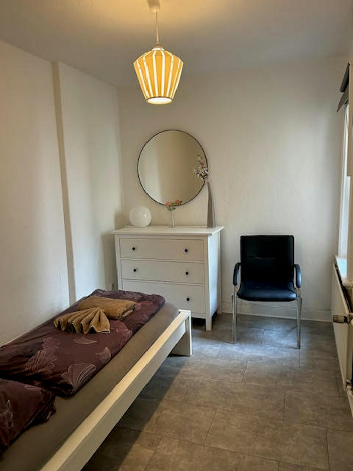 Das Schlafzimmer 1 ist ca. 12 qm groß. mit einen Einzelbett (90 X 200cm), ein Kleiderschrank, 1 Tischlampe eingerichtet. Daunendecken und Kissen sind vorhanden