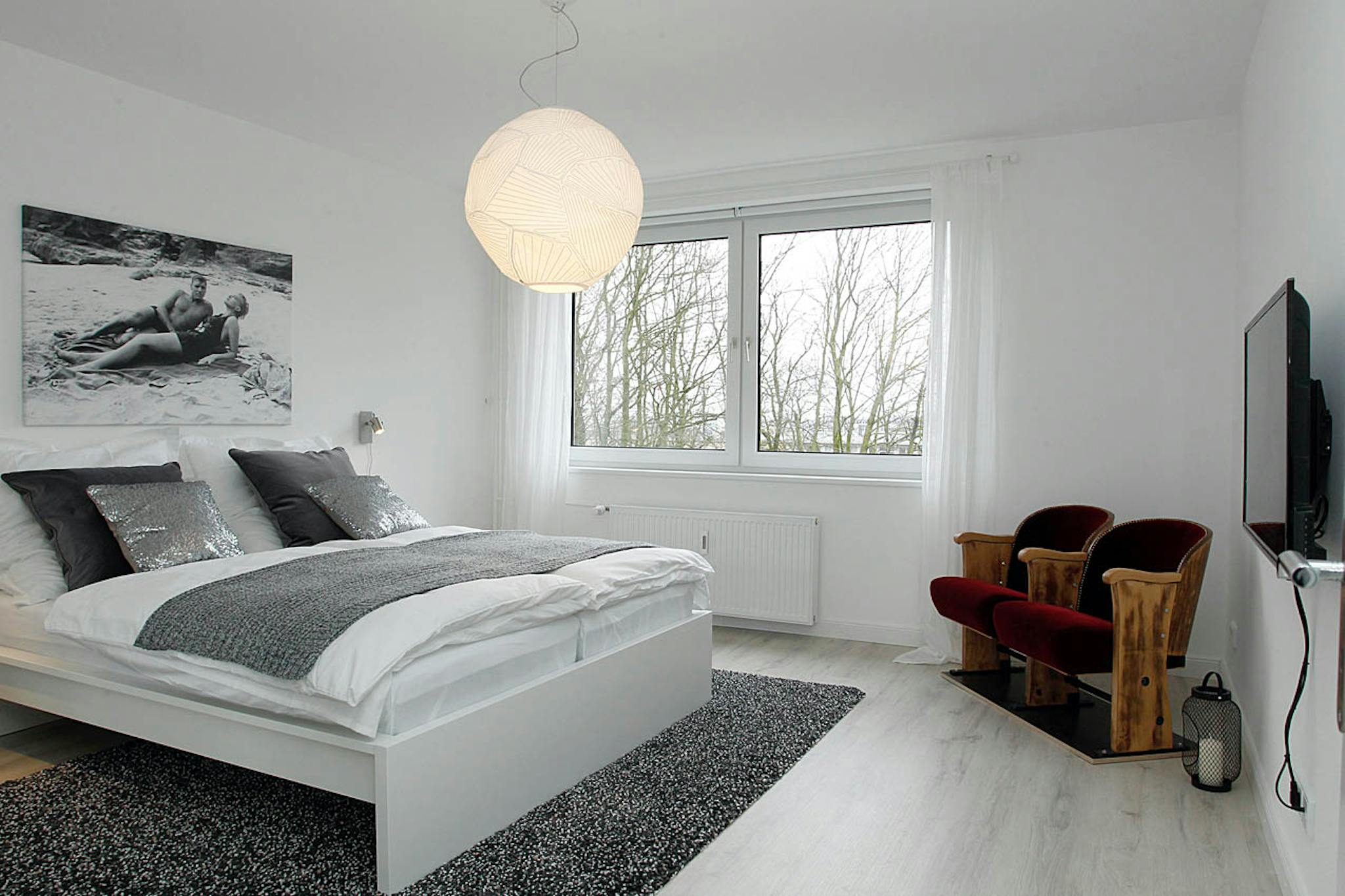 Die Wohnung verfügt über einen großen Wohn- Essbereich mit Küchenzeile. Die Küche ist voll ausgestattet mit Nespressomachine und Spülmaschine. Außerdem gibt es ein Schlafzimmer mit großem Doppelbett, ein Arbeits- und Gästezimmer mit ausziehbarem Bett, und ein modernes Duschbad. Man kann dort bequem auch zu zweit mit getrennten Schlafzimmern wohnen.