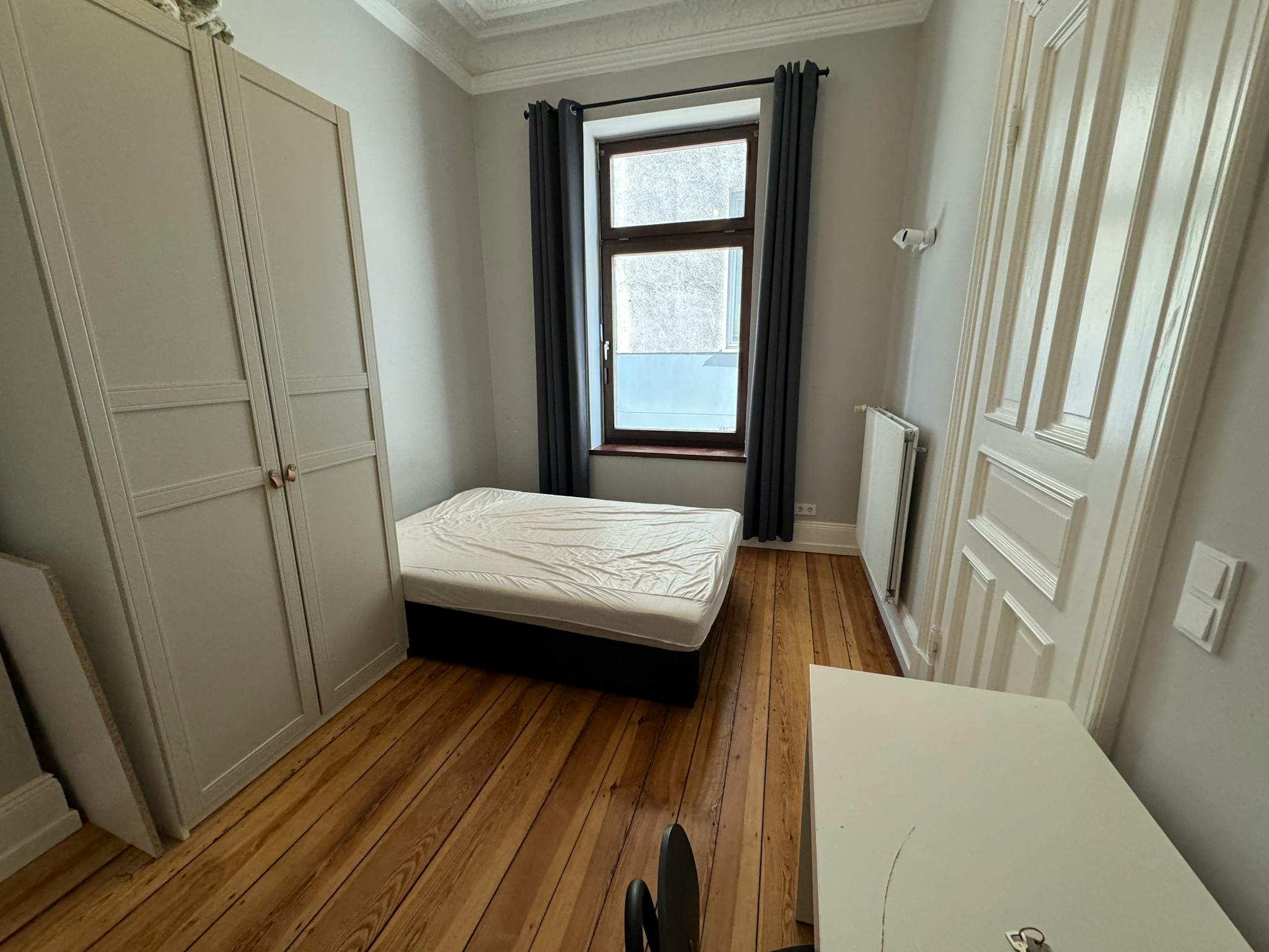 Dieses Zimmer ist bereits möbliert und mit Bett, Schrank, Schreibtisch & Co. ausgestattet. Sogar die Vorhänge sind angebracht.
