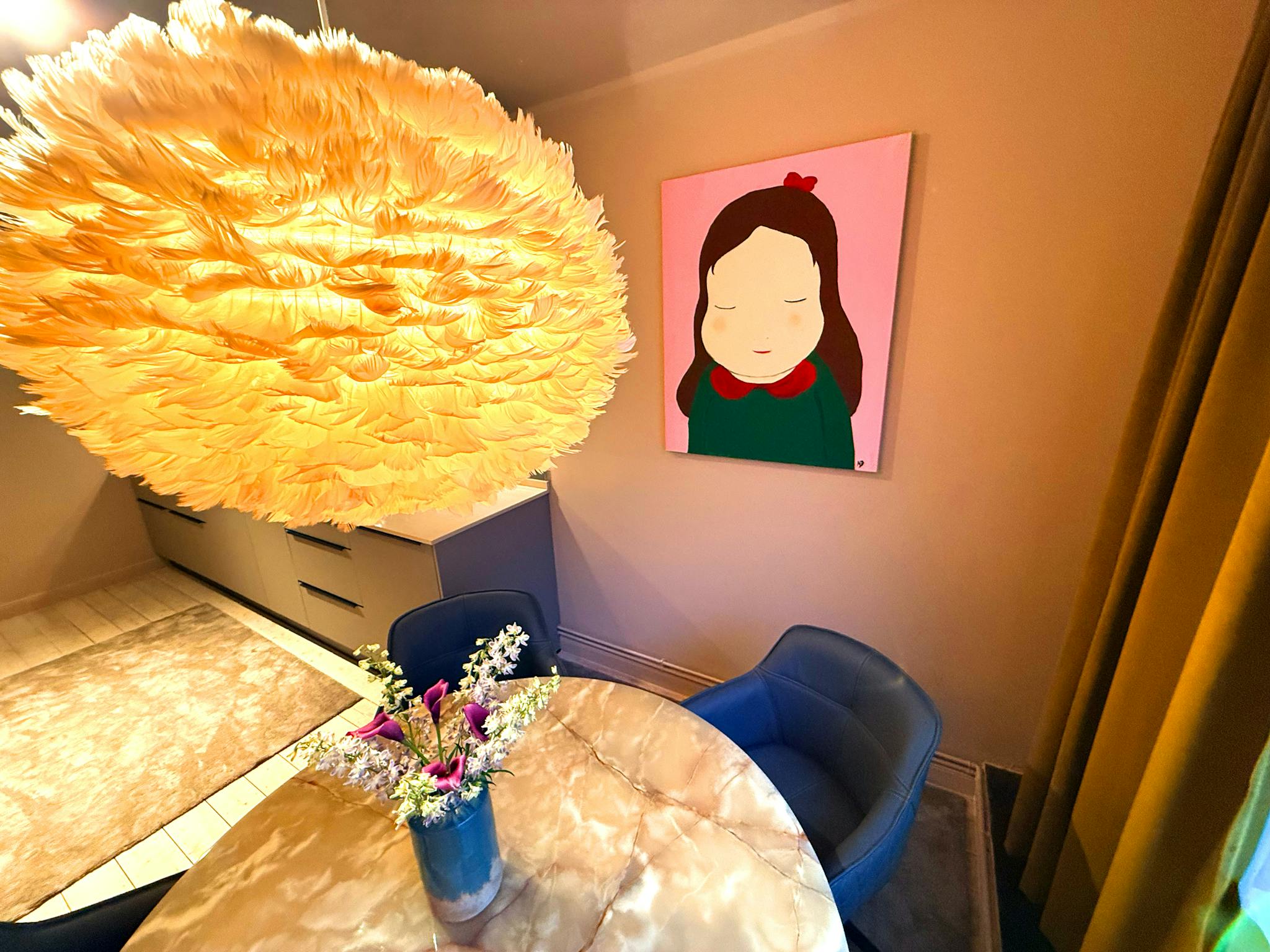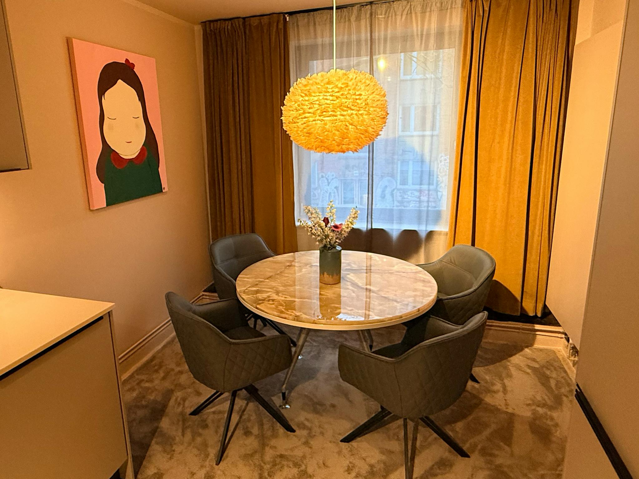 Deine große Küche mit Essbereich für vier ist in warmem Greige gehalten. Naturstein-Arbeitsplatte, Geschirrspüler, Waschtrockner, großzügiger Kühl- und Gefrierschrank, hochwertiges Finebone-China-Geschirr und Kristallgläser für das verdiente Glas Wein nach einem langen Tag gehören zur kompletten Ausstattung. Und natürlich gibt es eine Moccamaster für die locally roasted Kaffeespezialitäten der Coffee Shops der Umgebung. Der runde Tisch mit Marmorplatte ist ein Eyecatcher –dazu vier Ledersessel und eine Federleuchte, die den ganzen Raum in warmes Licht taucht. Perfekt für lange Homeoffice-Sessions und den Call, der gar nicht mehr aufhören mag. Vorhänge, die den Blick auf die Bartelsstraße rahmen – oder ihn verschwinden lassen, wenn Du Ruhe brauchst.
