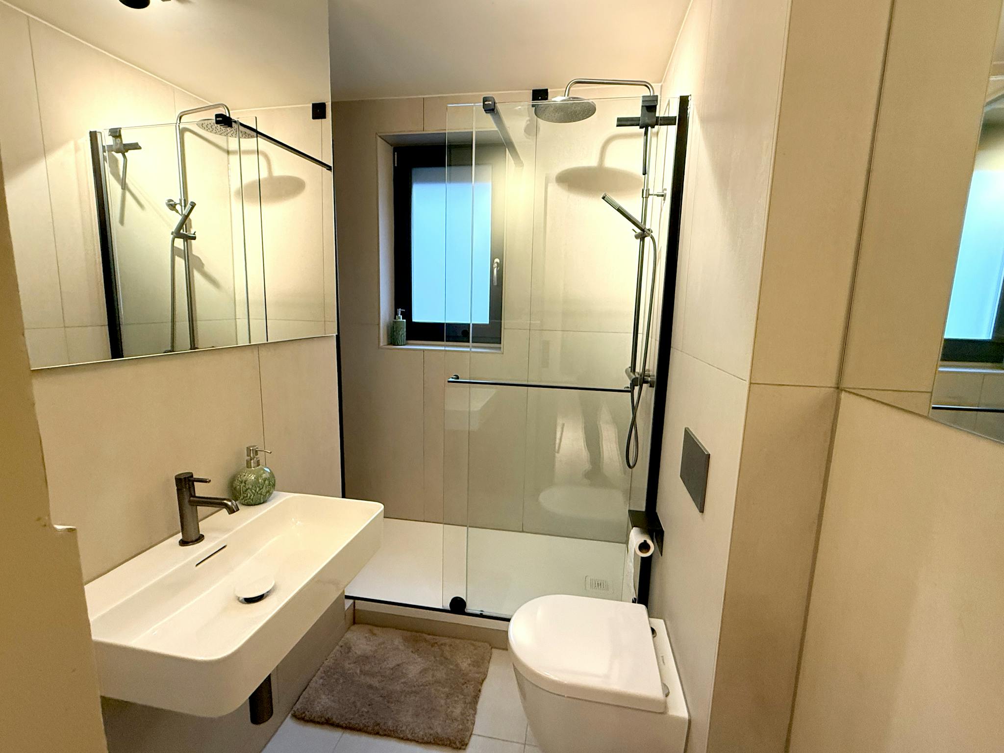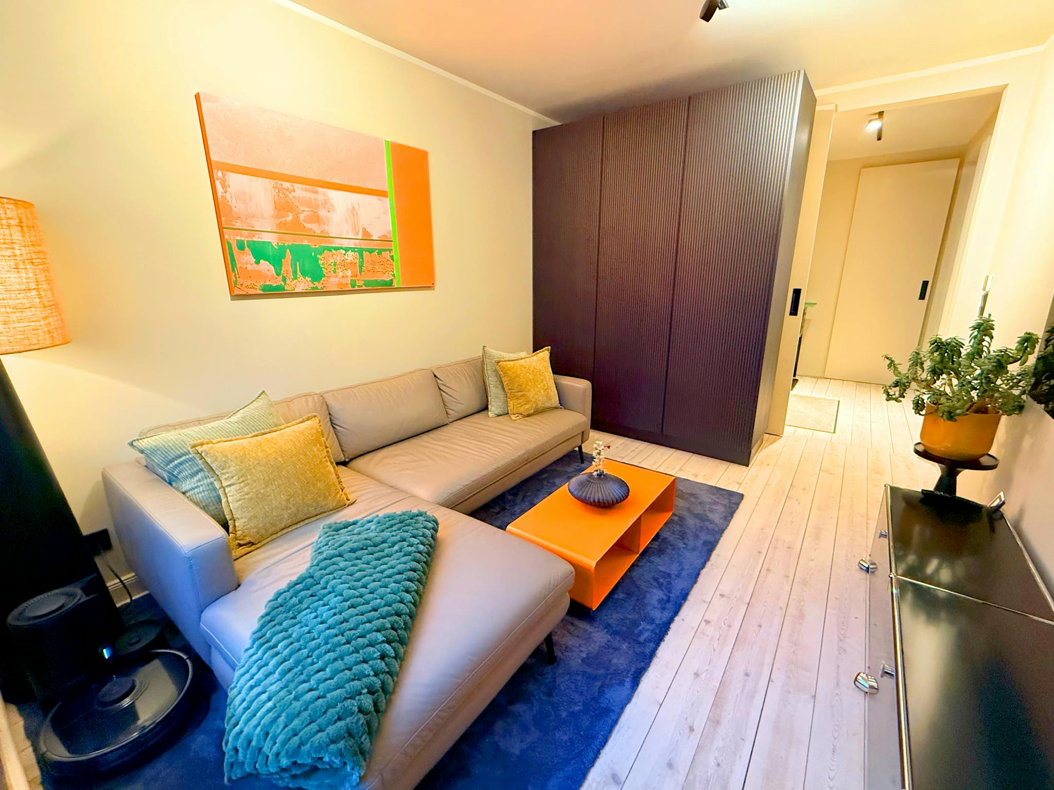 Im Wohnzimmer ein bequemes Ledersofa, OLED Smart TV und Designklassiker mit viel Stauraum. In der Luft läuft 100-Mbit-DSL mit neuestem Modem – flink und unaufgeregt fürs Homeoffice. Verbunden mit Smart-Home-Heizungssteuerung und einem Saugroboter ist es nicht nur immer schön kuschelig, sondern auch wie durch Geisterhand immer sauber. Duschen solltest Du allerdings schon selber.