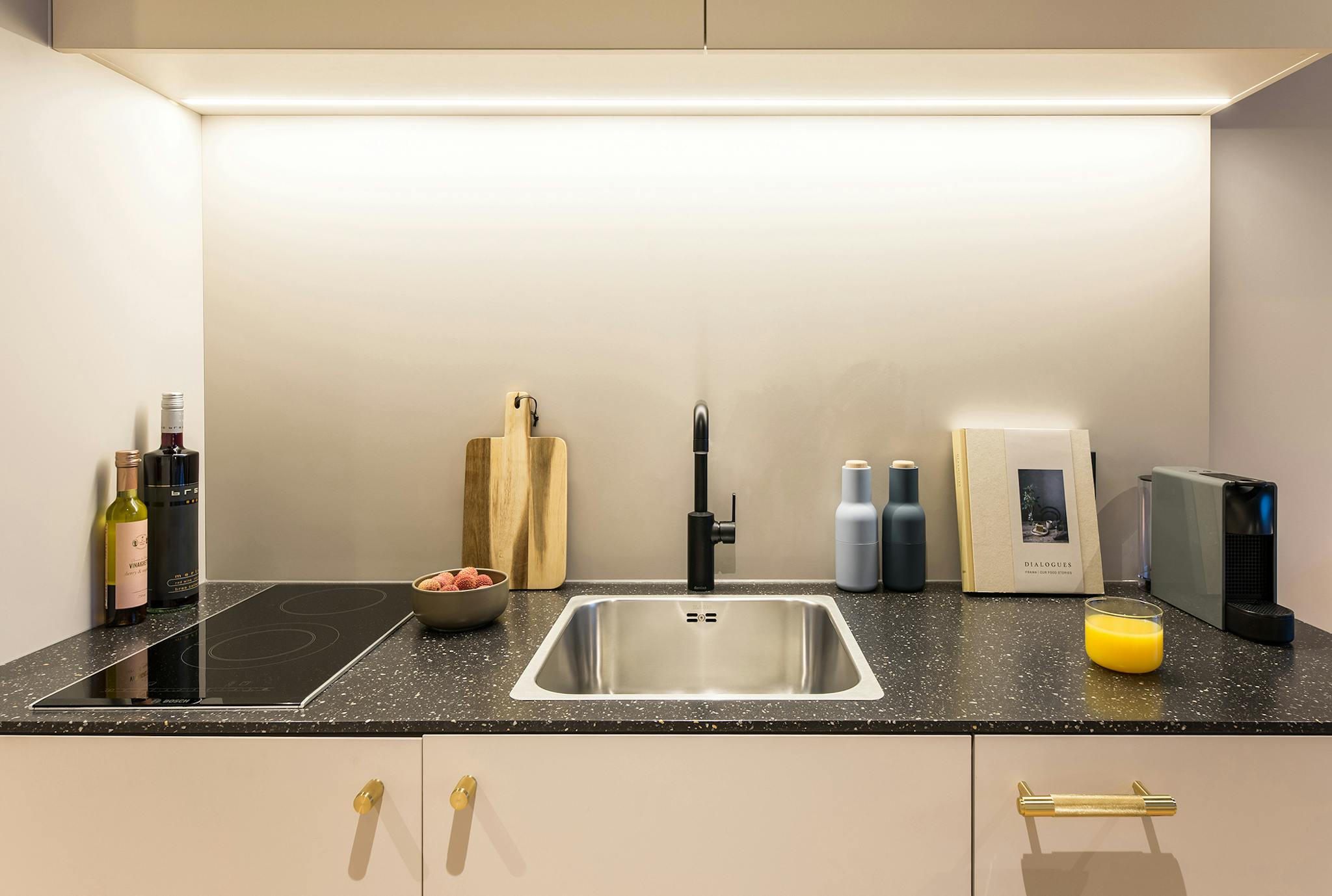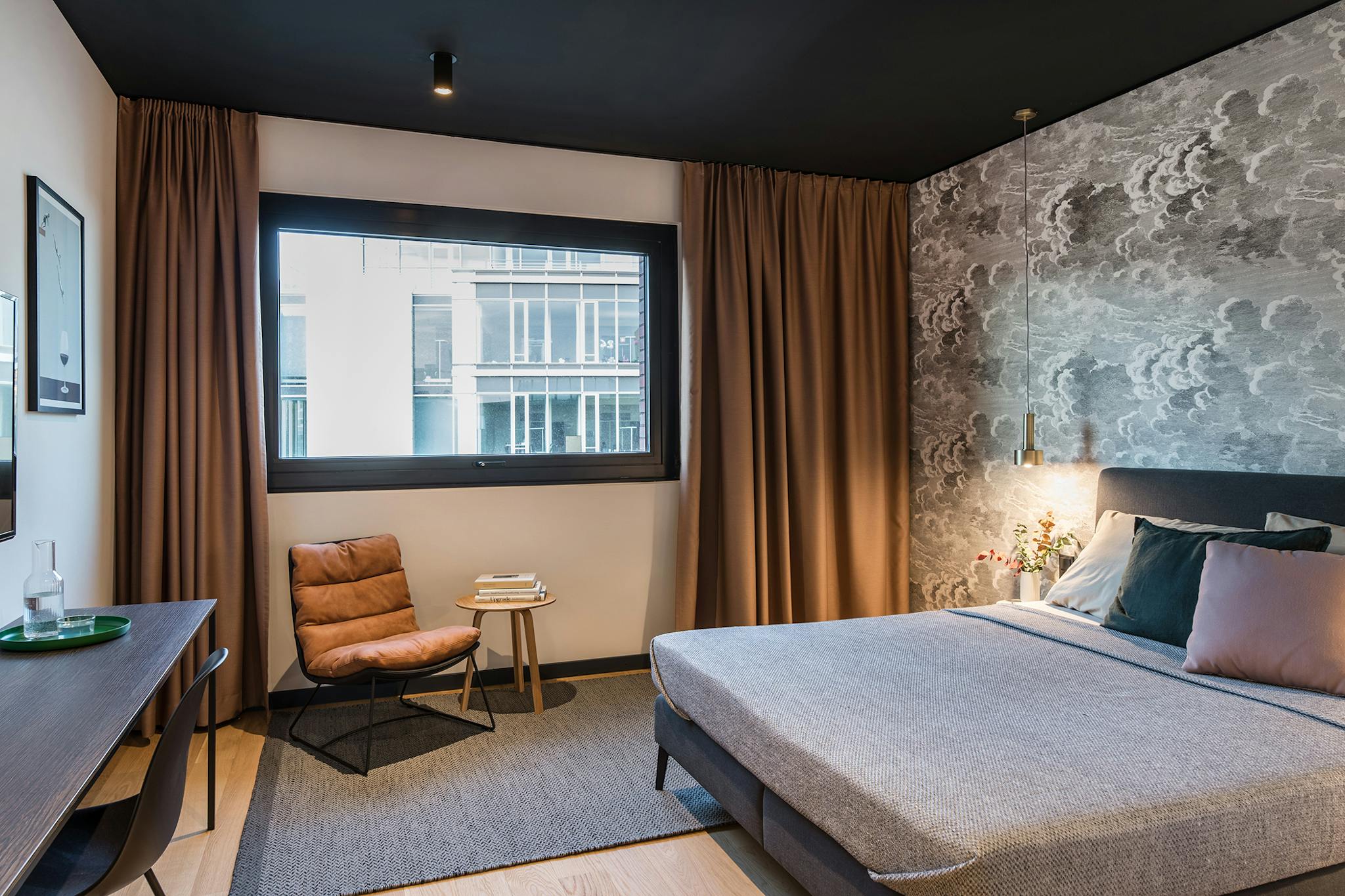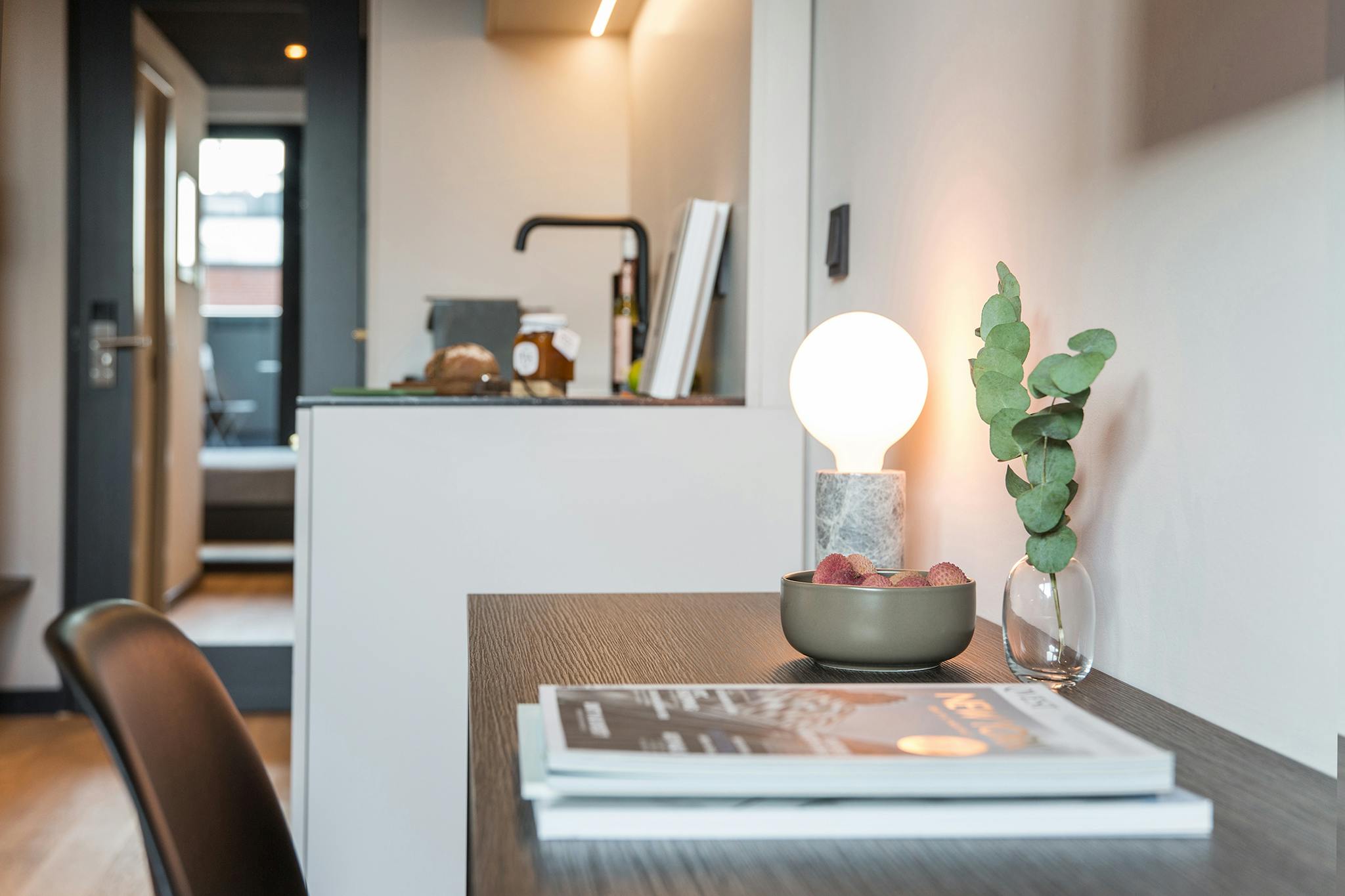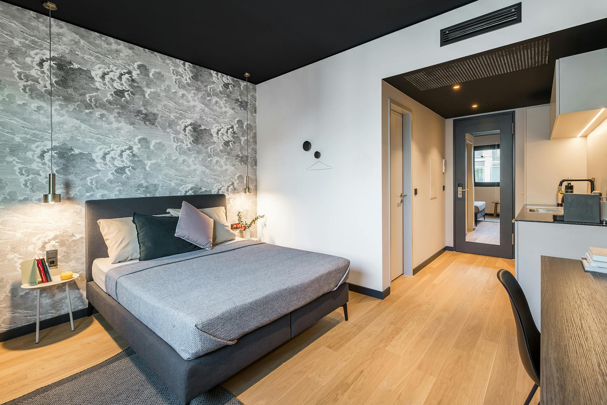 This cleverly designed apartment includes a 140cm/160cm bed from Möller-Design, a dedicated workspace, and a stylish lounge chair. Enjoy modern conveniences such as high-speed Wi-Fi, a flat-screen TV, and a Bluetooth sound system for a relaxing or productive stay. Shared facilities include high-tech building systems, a communal laundry area with washing machines and dryers, and even a concierge team for added convenience.