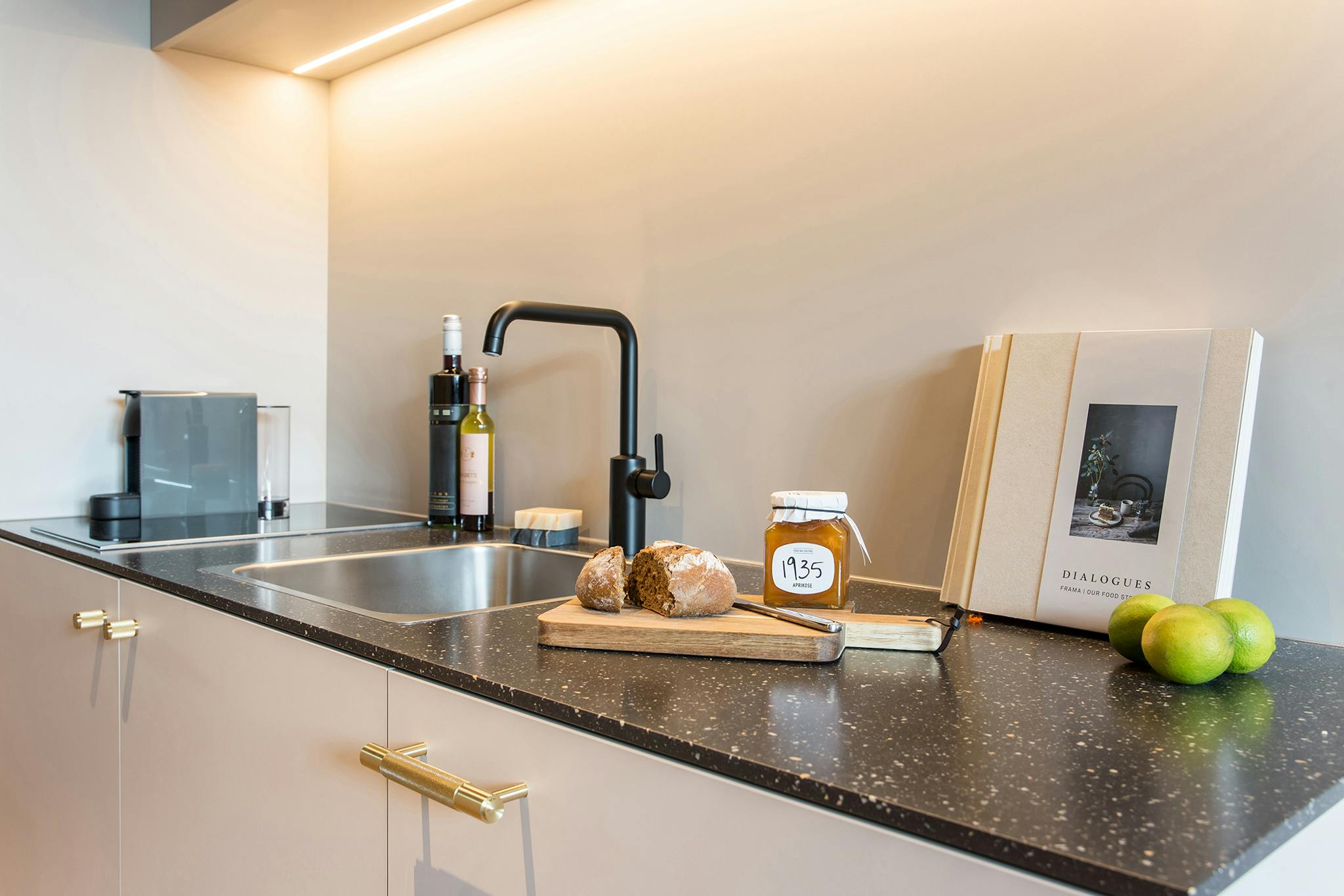 The apartment boasts high-quality designer furniture paired with custom-built fittings, creating a sophisticated and inviting atmosphere. Thoughtful touches like wooden floors in the living area, underfloor-heated porcelain tiles in the bathroom, and ambient lighting provide a warm and cozy feel. The bespoke designer kitchen is equipped with everything you need, including top brands like Vitra, Muuto, and Hay, ensuring a seamless cooking experience.