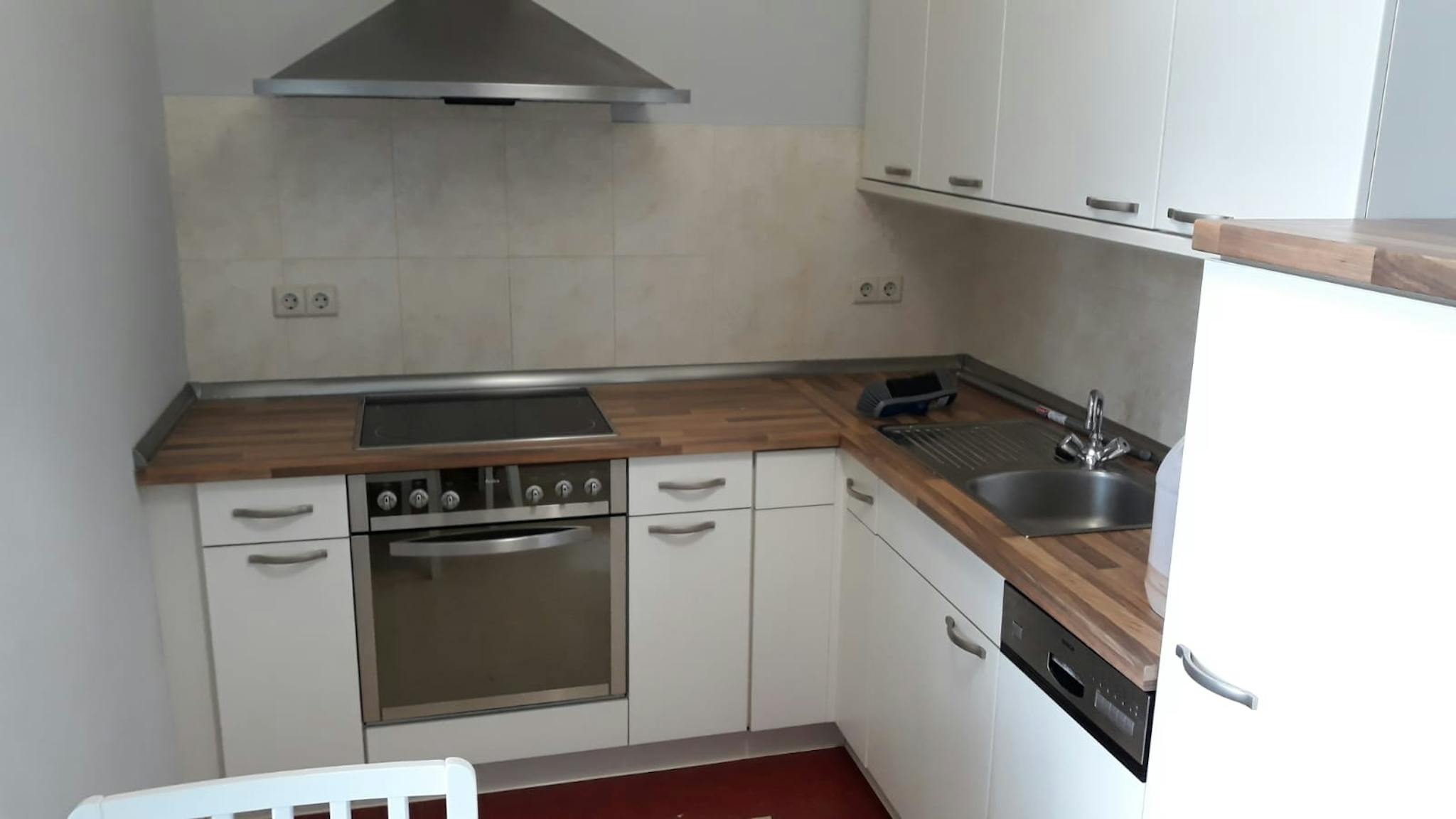 Einbauküche, mit Cerankochfeld, Backofen, Dunstabzugshaube, Kühlschrank, Gefrierfach, Spüle und Geschirrspüler. Esstisch mit Stühlen.