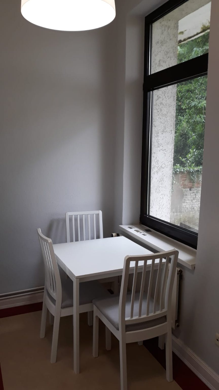 The renovated room with a garden view is located on the higher groundfloor of a completely renovated old building apartment.