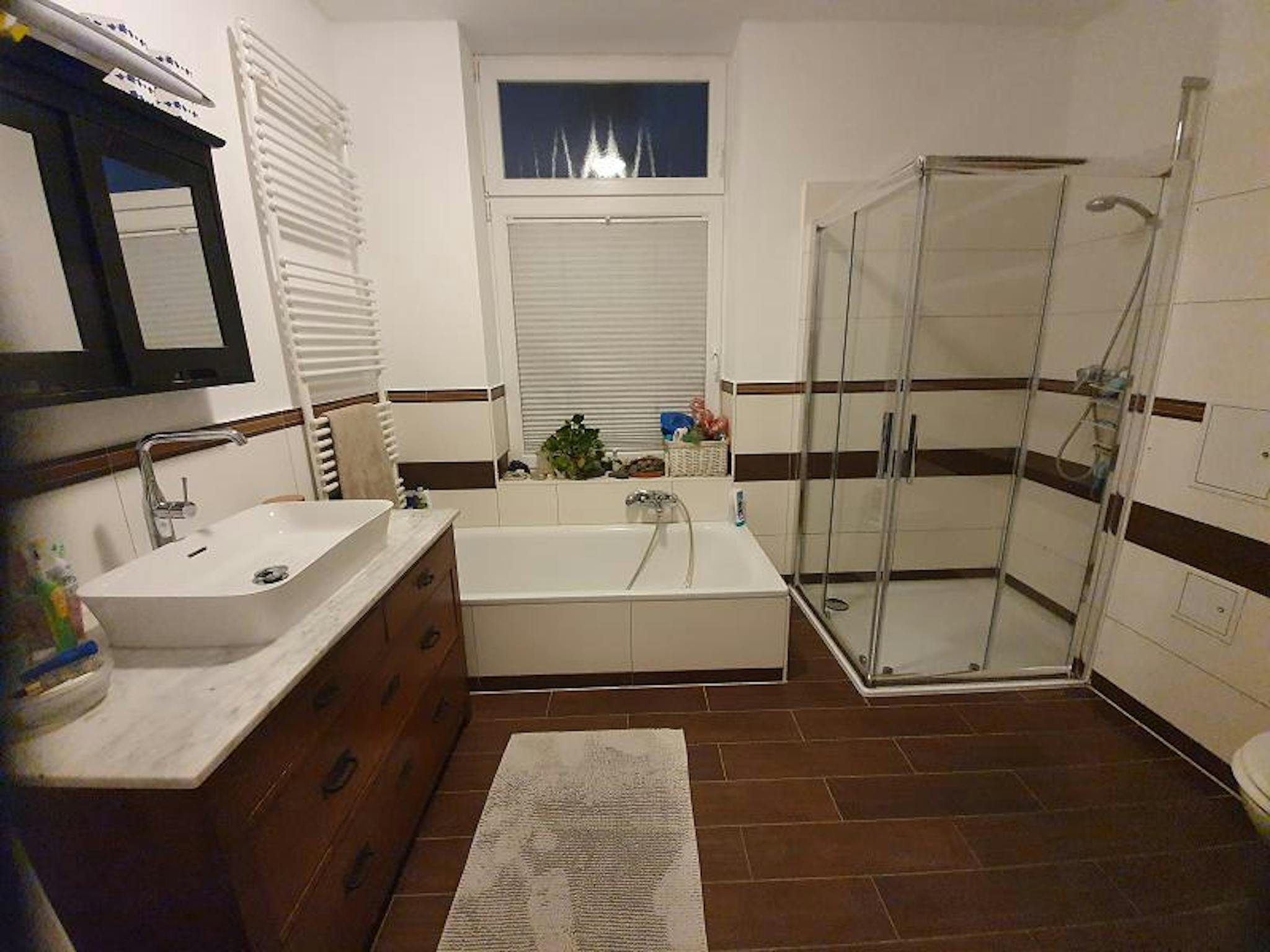 Geräumiges Bad mit Waschbecken, Dusche, Vollbad und Toilette.