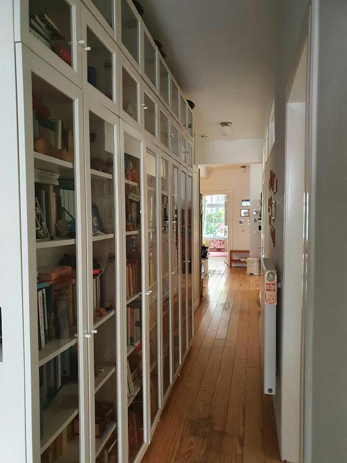 Flur mit großem Einbau-Kleiderschrank und Bücherregalen.