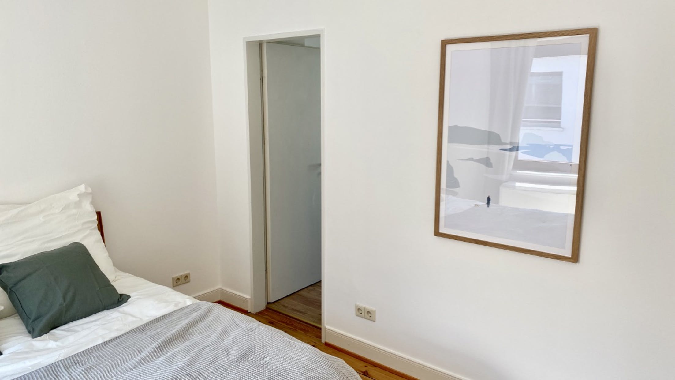 Interior: Double bed, side table, armchair, floor lamp, closet, hangers, artwork & bedding