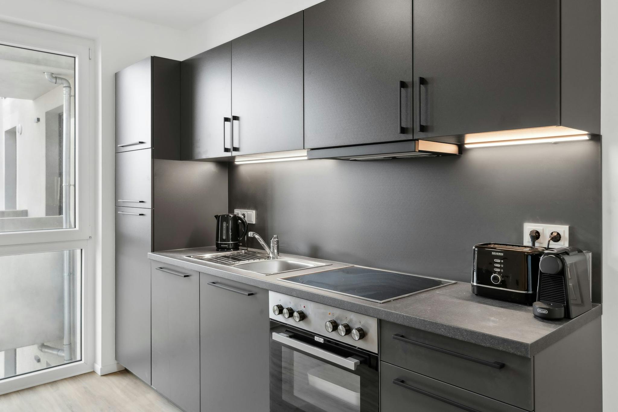 Welcome to your own cozy retreat. Part of our brand new apartments in Leipzig, your private bedroom is thoughtfully designed with a comfy bed, bedside tables, plenty of storage for your things, and a desk that’s perfect for working or studying from home.