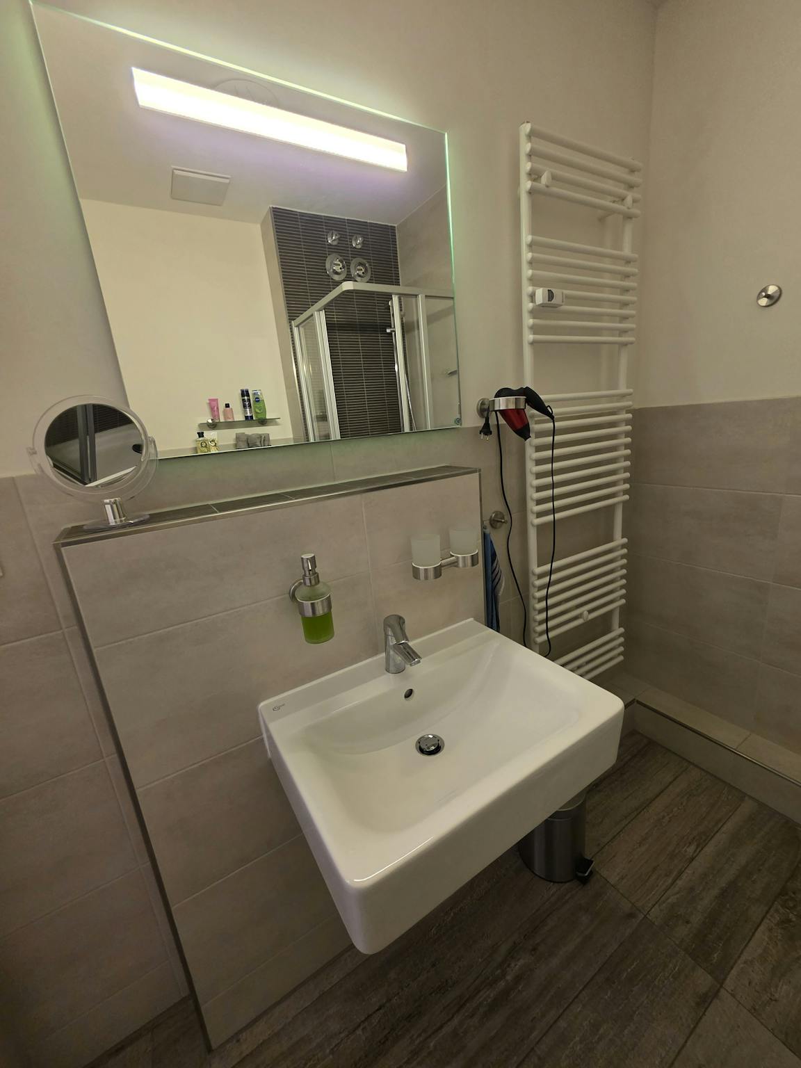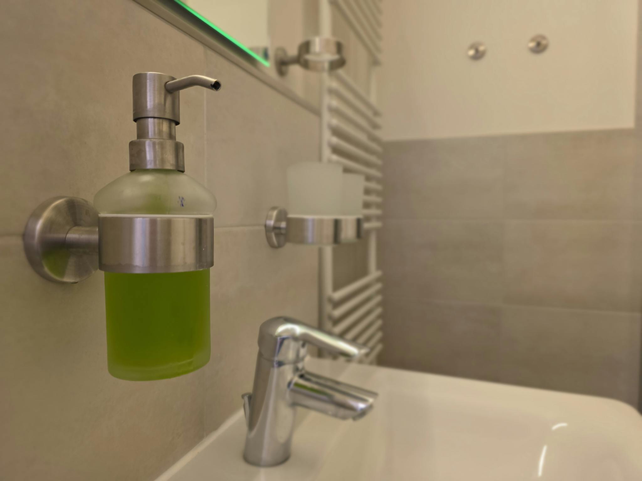 Auch für längere Aufenthalte bietet die Wohnung eine praktische Ausstattung mit Waschmaschine, Wäscheständer und Bügelset direkt im Apartment.