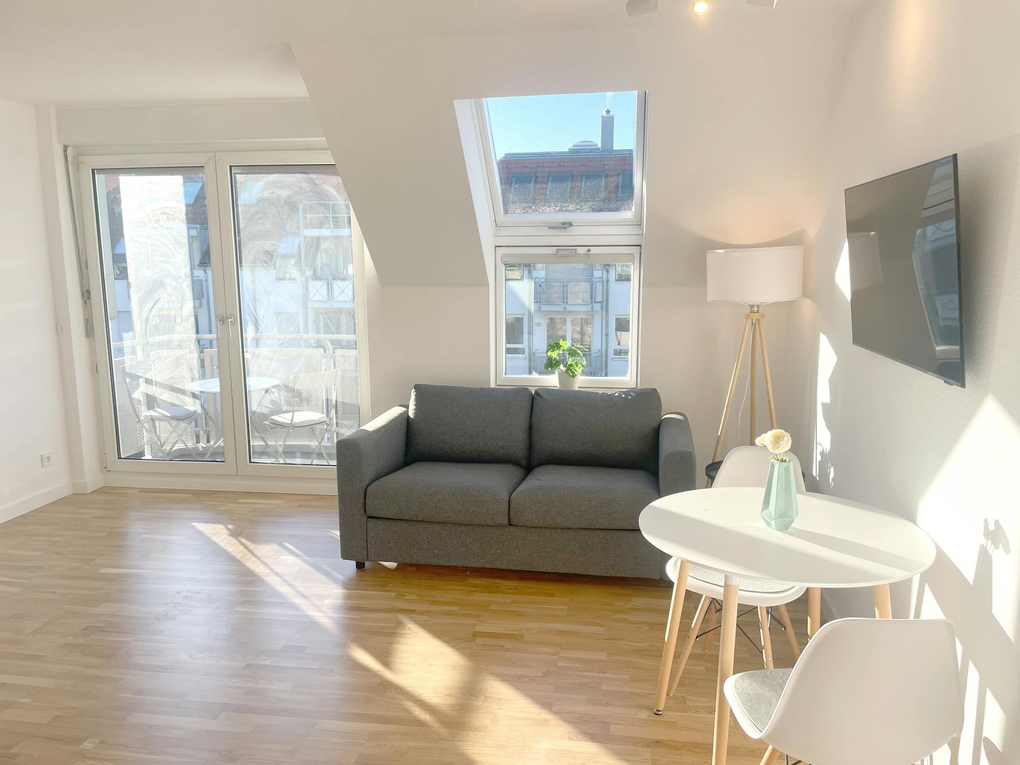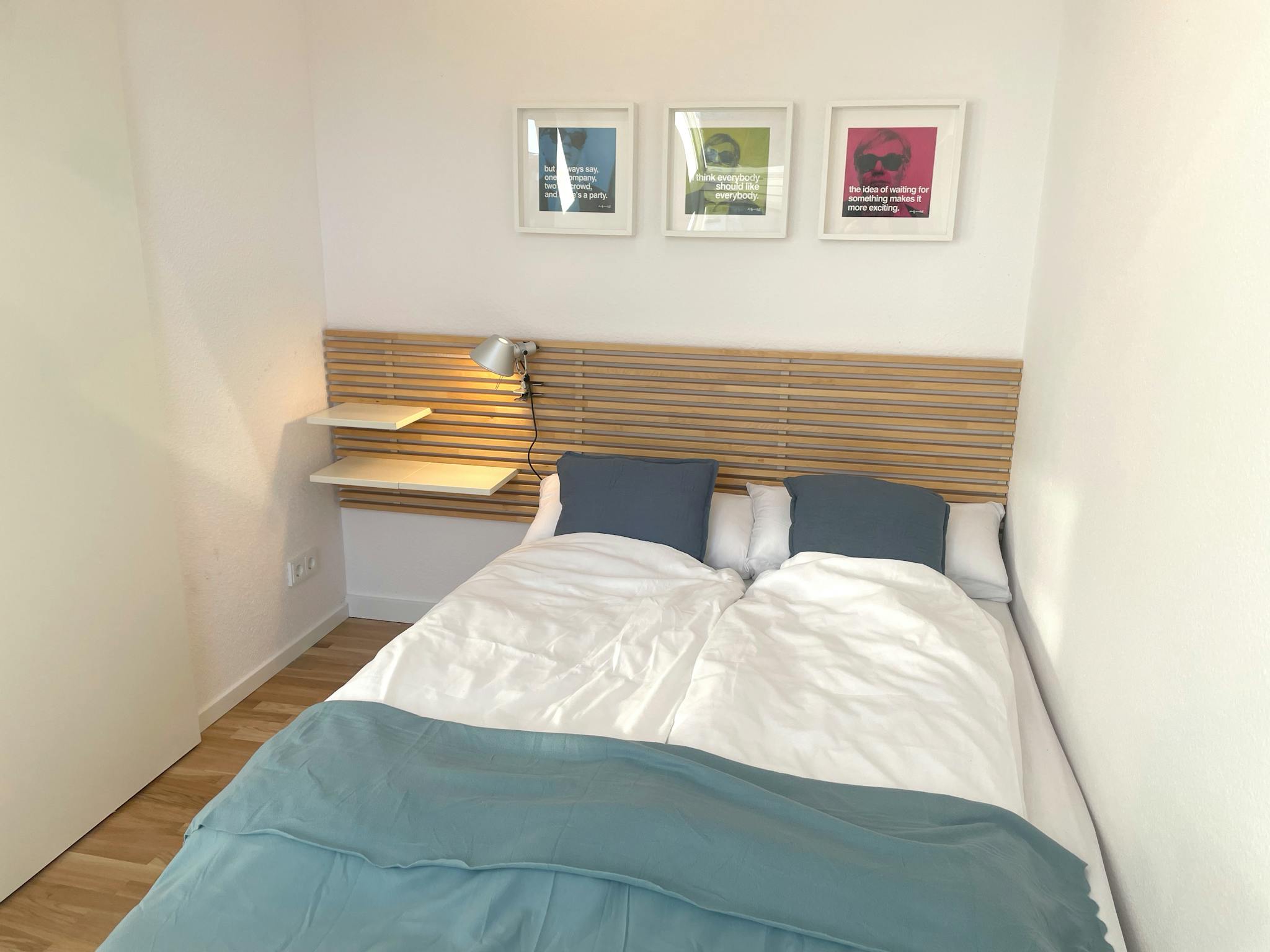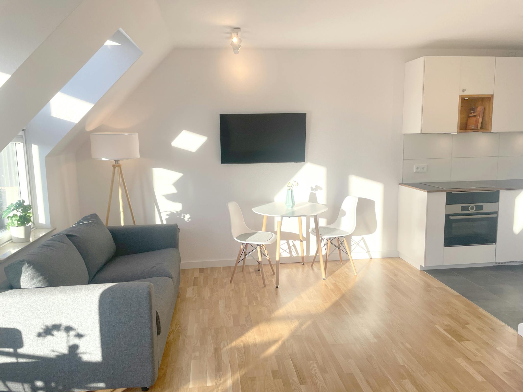 The very bright apartment on the 3rd floor of an apartment building conveys a spacious living flair with its 40 square meters. The apartment has recently been renovated and furnished to a high standard. The flooring is real wood parquet and dark gray / medium gray tiles. A large built-in wardrobe in the hallway, 2-seater sofa with side table and floor lamp, wall-mounted Samsung Smart TV, dining table with 2 chairs invite you to move in straight away. The bedroom consists of a bed with a lying area of (hidden) m with storage options and a sideboardwith a mirror.