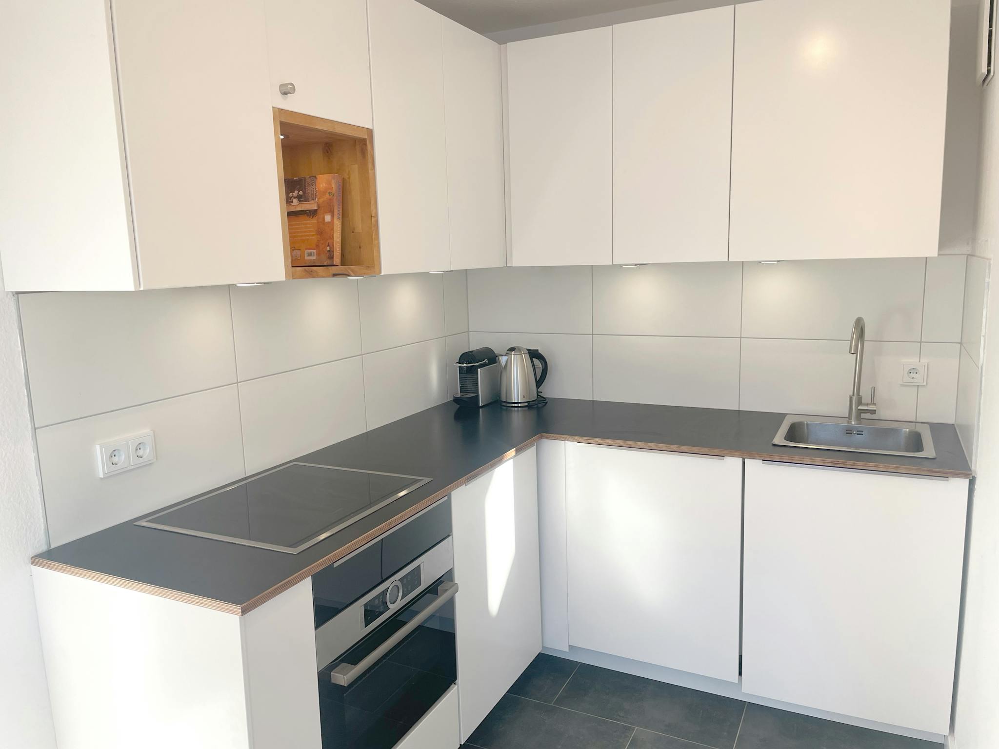 The fitted kitchen is brand new with a Bosch refrigerator and oven, Siemens hob and dishwasher and is already equipped with crockery, cutlery, cups, pan, pot, WMF kettle and Nespresso machine.