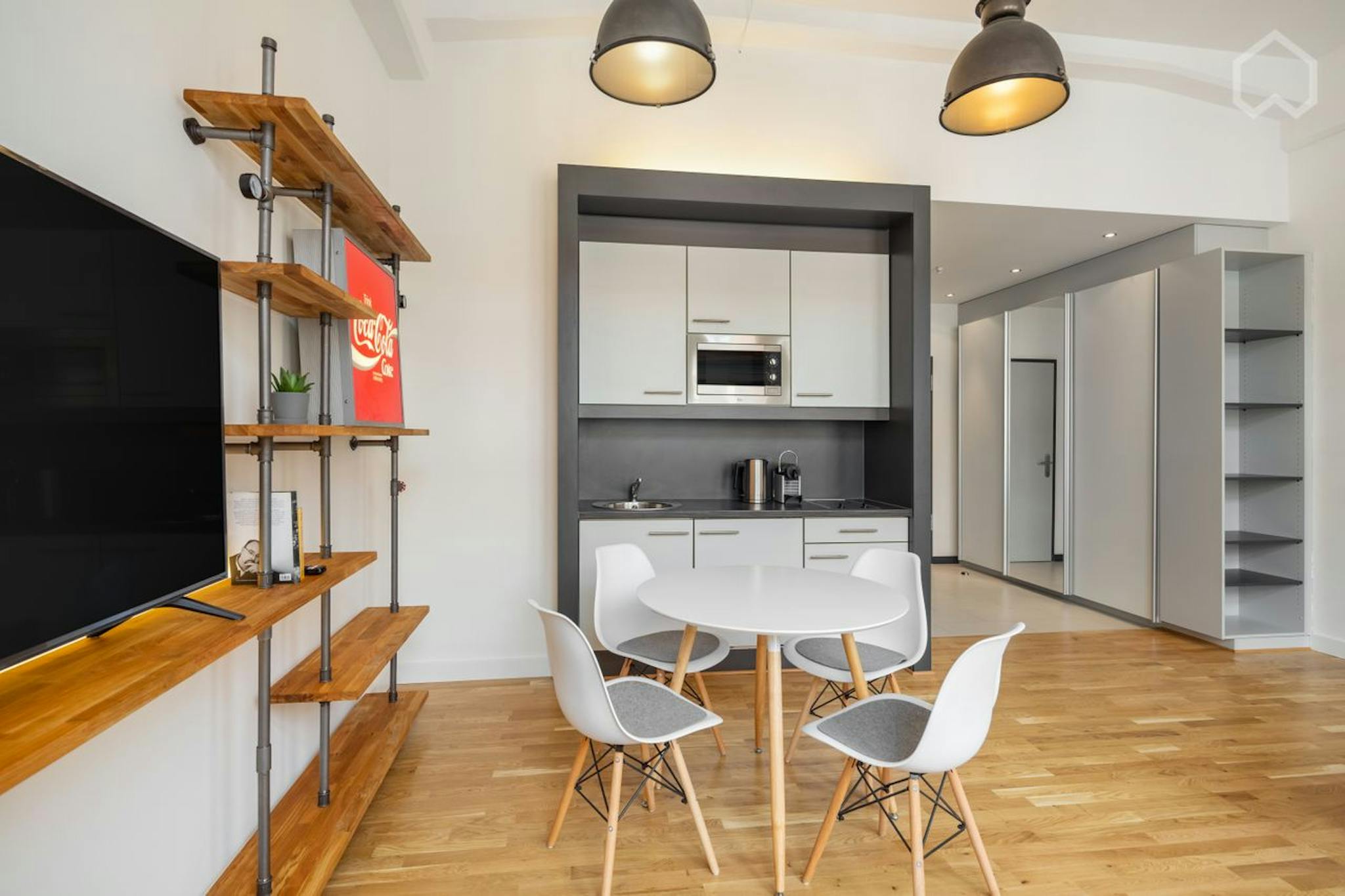 Das ehemalige Buchdruckerei-Gebäude wurde zu einem loftähnlichen Wohnhaus umgebaut und dabei sehr modern und hochwertig saniert. Die lichtdurchflutete Wohnung wurde mit hochwertigen Materialien rekonstruiert und mit einem neuen Eichen-Parkettboden ausgestattet. Die Einrichtung wurde liebevoll gestaltet mit einem Mix aus Industrial Elementen und leichtem skandinavischem Design.