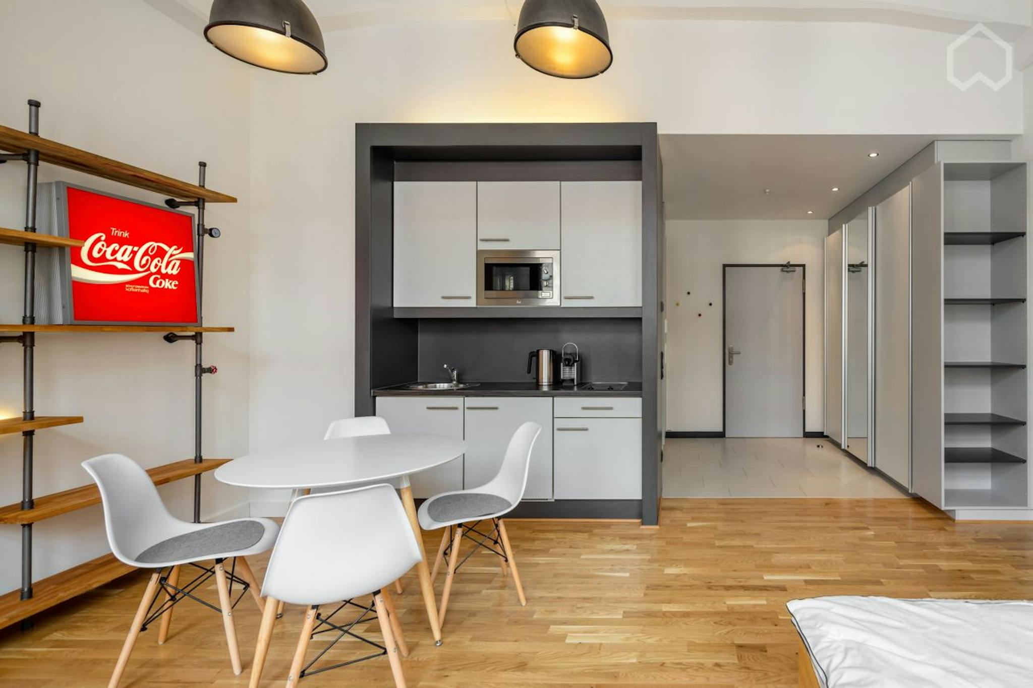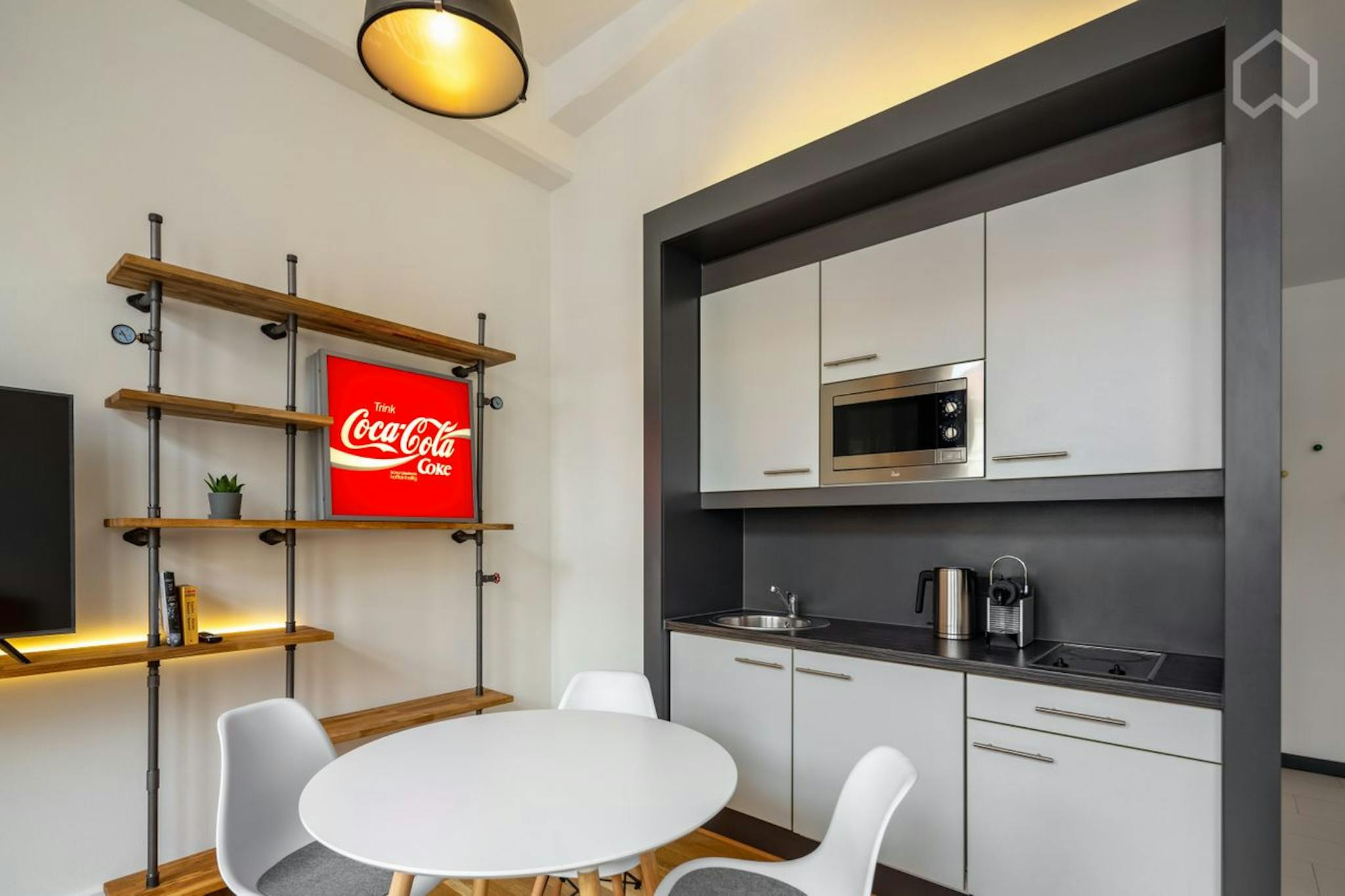 Der 3,60 m hohe Raum ist durch die drei sehr großen Sprossenfenster lichtdurchflutet und gibt genügend Raum zum Entfalten und Wohlfühlen. Die Küche ist mit Kühlschrank, Mikrowelle und zwei Ceran-Herdplatten gut ausgestattet. Neben Nespresso-Maschine und Wasserkocher finden sich alle wichtigen Utensilien, wie Geschirr, Gläser, Töpfe und Pfanne.