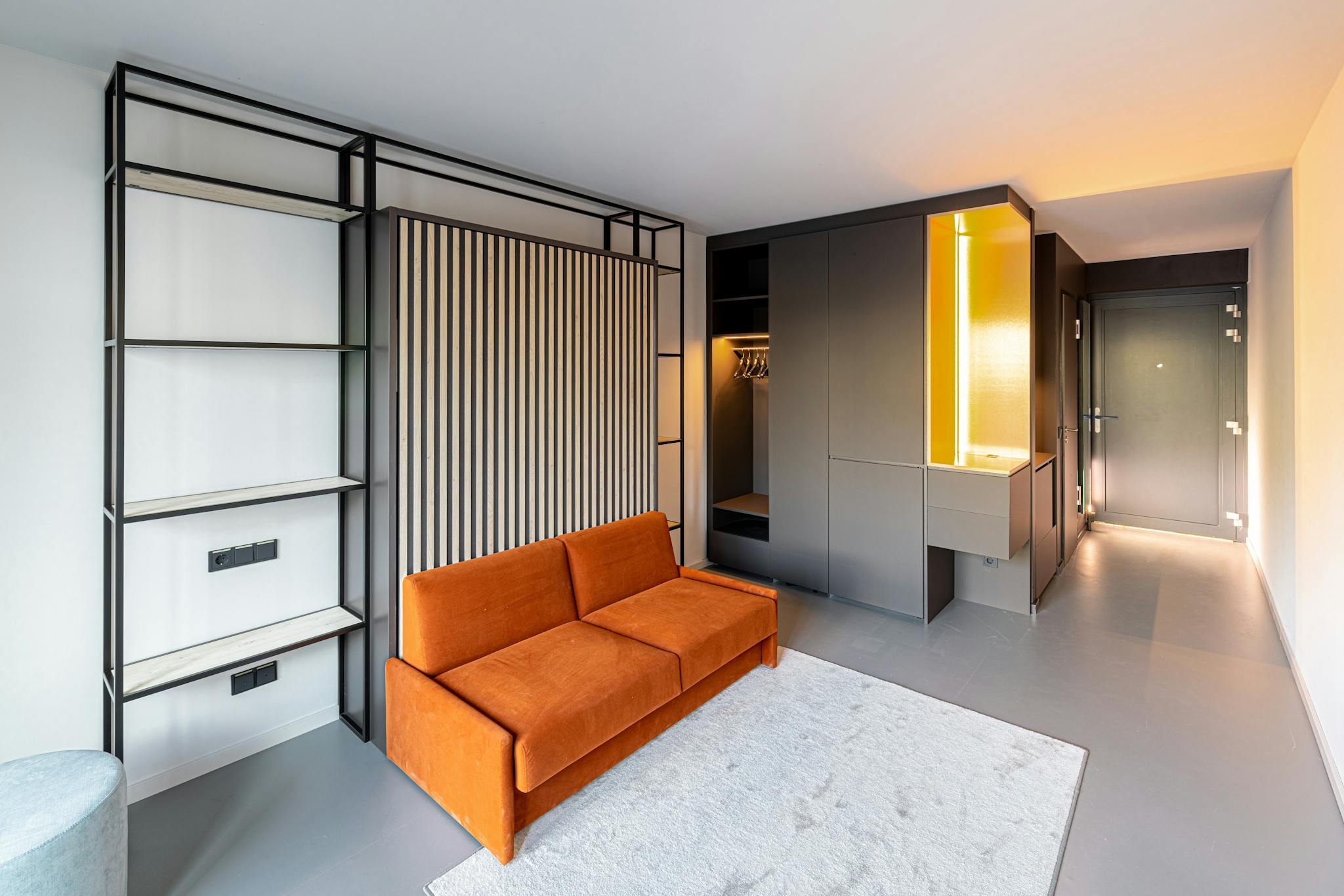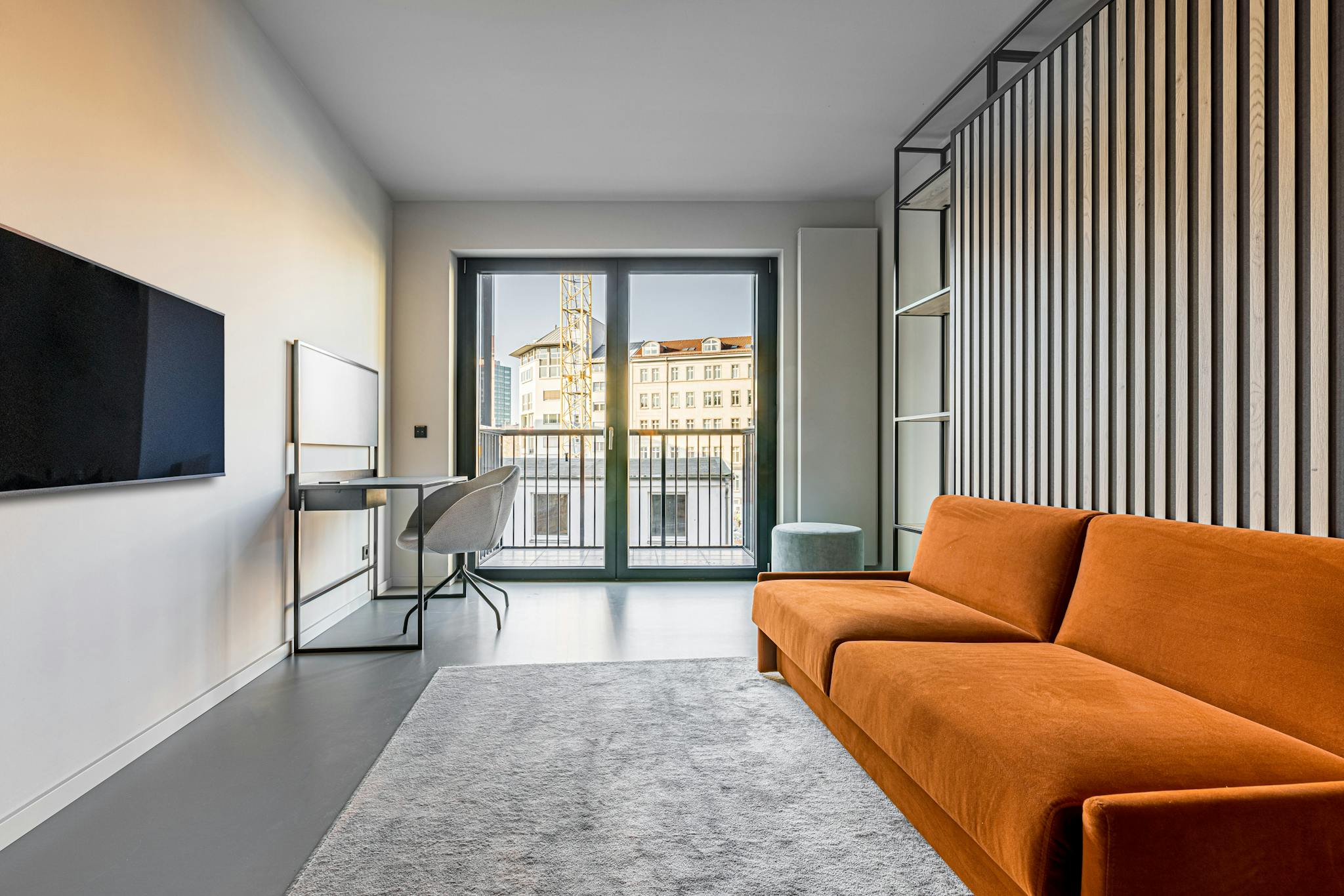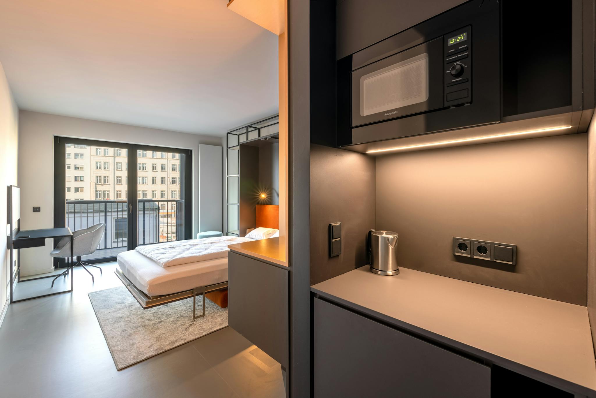 Non-SmokingNot allowedDas Apartment zeichnet sich neben deinem eigenen Balkon durch einen weitläufigen Wohn- und Arbeitsraum aus. Genieße unvergleichliche Freiräume in unserem größten und luxuriösesten Apartment. Hier erlebst du herausragenden Komfort - und kannst dich ganz wie Zuhause fühlen. Das Apartment lässt sich ganz einfach an Deinen individuellen Lebens- und Arbeitsrhythmus anpassen. Ein Handgriff reicht aus, um den Raum zu verwandeln: Das modulare Bett klappt nach oben, verschwindet in der Wand und offenbart einen gemütlichen Wohnbereich mit Couch. Alle Apartments überzeugen mit einladender Atmosphäre, einem gemütlichen Ambiente und überdurchschnittlichem Komfort dank durchdachter Einrichtungsdetails. Die moderne Ausstattung mit High-Speed WLAN und Internet, Flat-Screen TV, Espressomaschine, Kühlschrank u.v.m. lässt keine Wünsche offen.