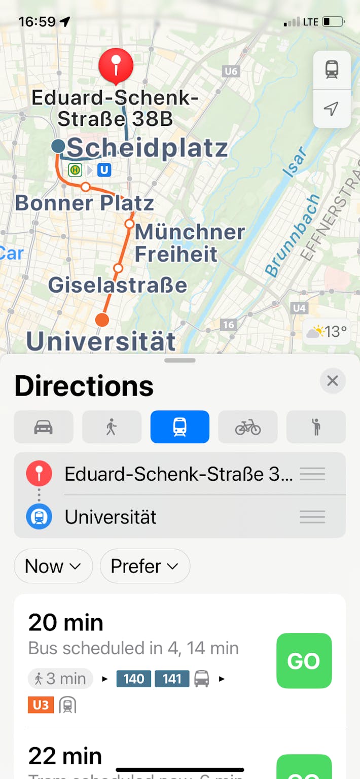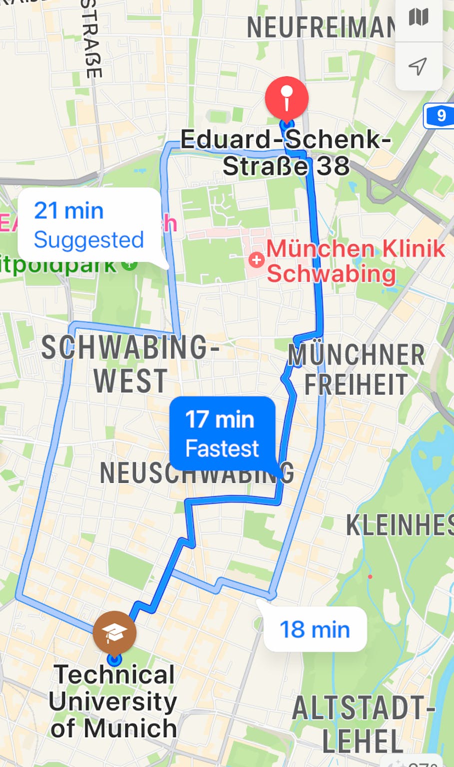 - 13 min by bicycle to the LMU and 17 min to TUM. 20 min by public transport.