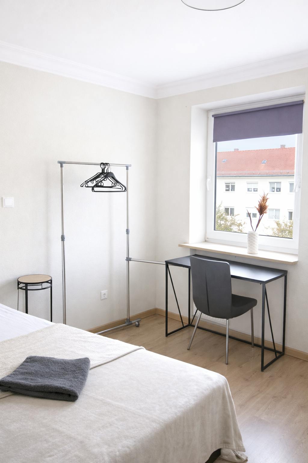 The room is furnished with a cozy bed, a spacious wardrobe, and a desk, providing a pleasant environment for both relaxation and productivity. The room features modern decor, central heating, and high-speed WiFi, ensuring a comfortable and well-connected living experience.