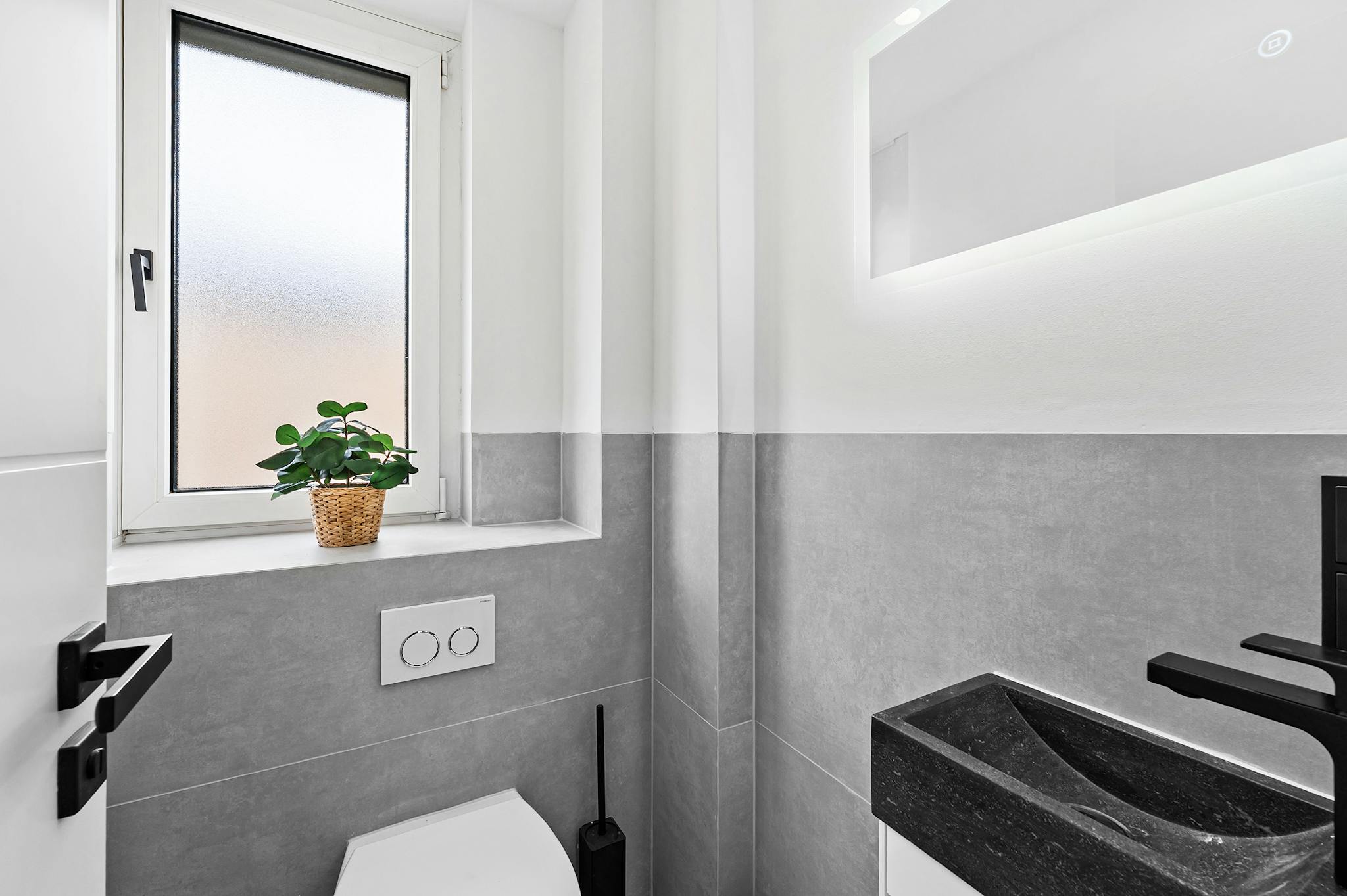 The generous hallway gives a very inviting impression and provides access to all rooms of the large apartment. The apartment also has a newly furnished bathroom with a washbasin and LED mirror, a towel radiator, a shower, a washing machine, a dryer and a toilet.