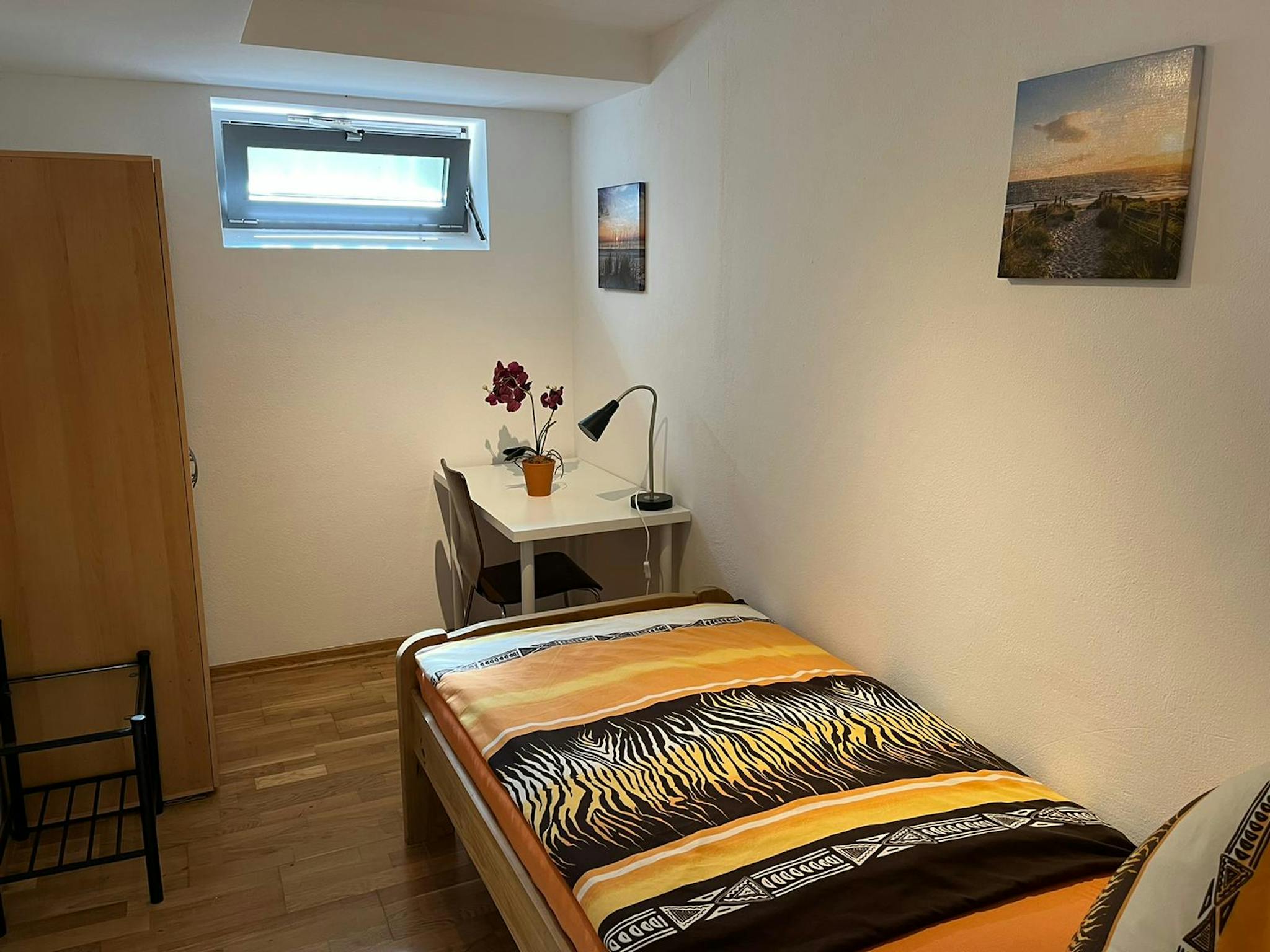 Die renovierte 3-Zimmer-Souterrainwohnung hat zwei kleinere Schlafräume mit Bett und Schrank, einen größeren Schlafraum mit ein/zwei Einzelbetten, Schränken und TV.