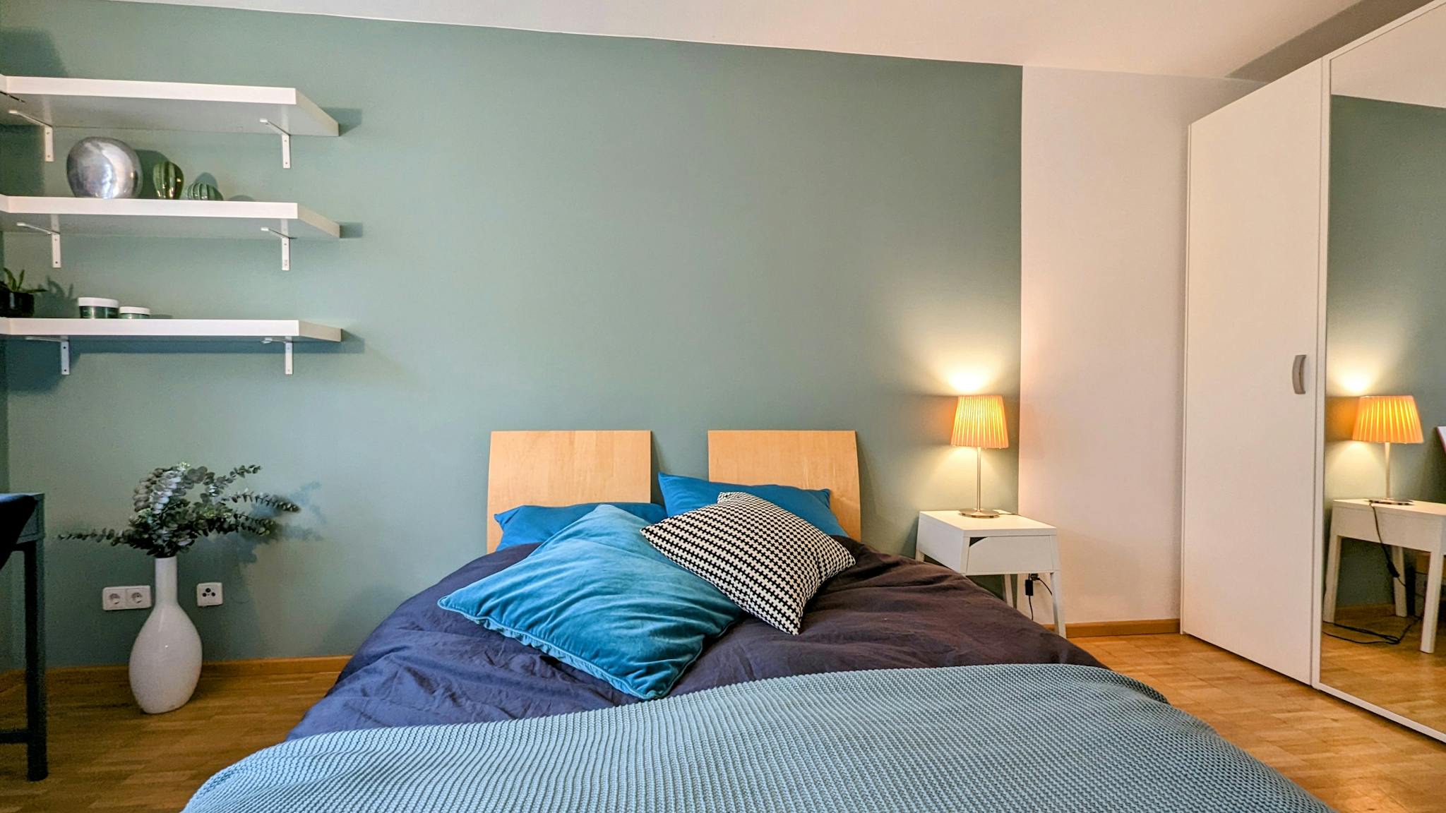 This modern bedroom offers a comfortable and cozy space. Enjoy the convenience of a fully furnished and equipped home, including a bed, wardrobe and a fully fitted kitchen featuring a hob, oven, fridge, microwave, and essential utensils. Relax with internet access, making this apartment perfect for mid-term stays.