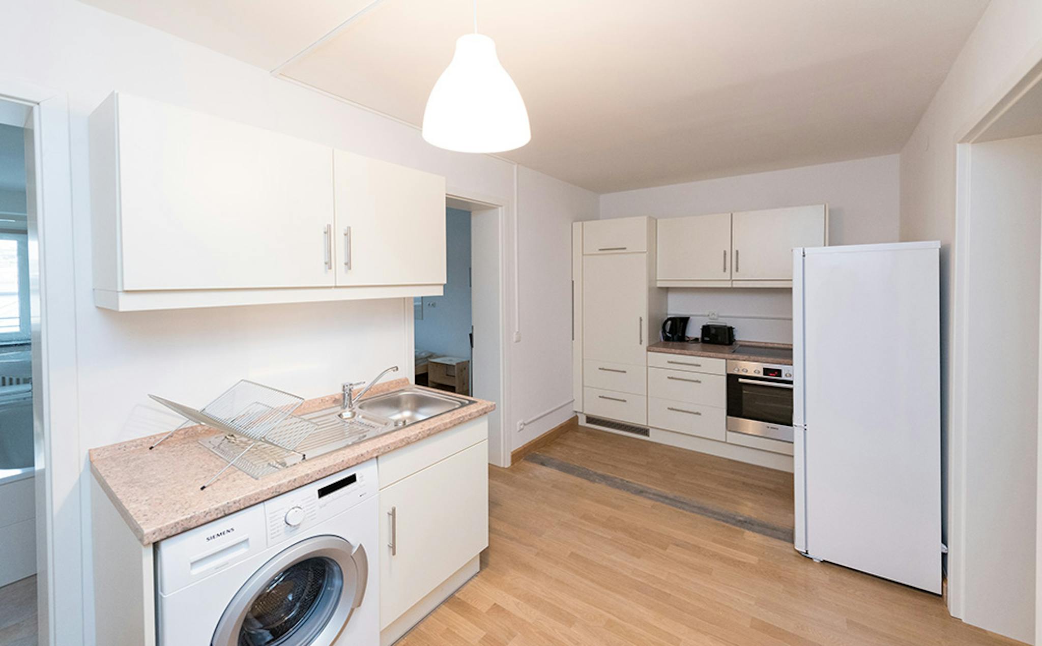 Our flats fulfil all your daily living requirements. Every flat comes readily equipped with a kitchen, including refrigerator, cooking equipment and dishes. Flats also include a washing machine and Wi-Fi Internet. Each room is fully furnished and offers a comfortable bed with fresh linen and a workspace. The area provides you with several shopping opportunities and excellent connections to public transport.