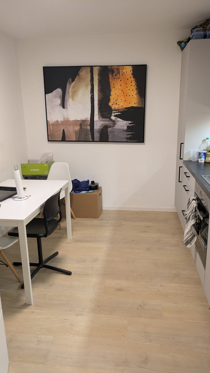 Supermarkets and a gym nearby. The place has a Washingmachine, a dryer, and a Dishwasher