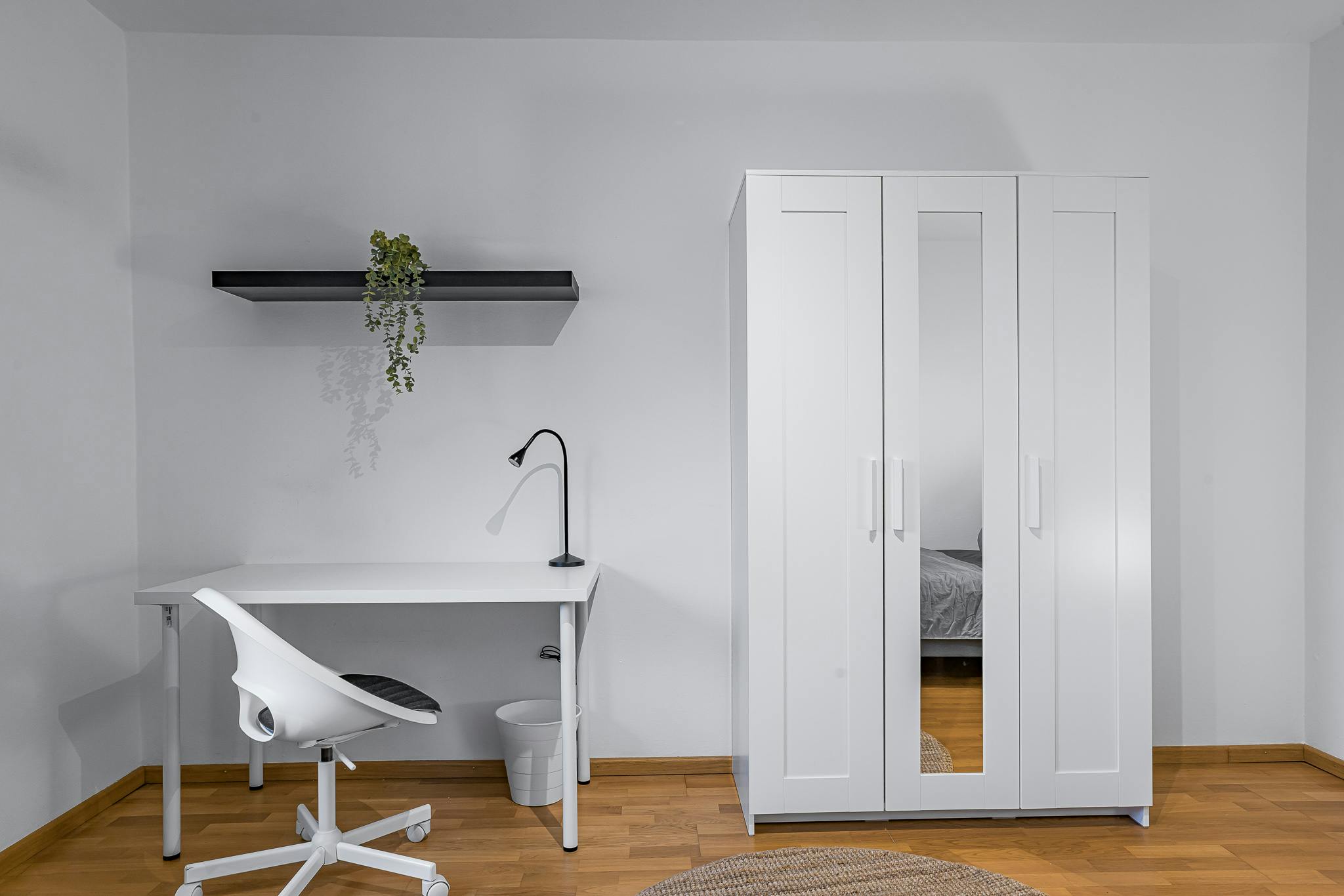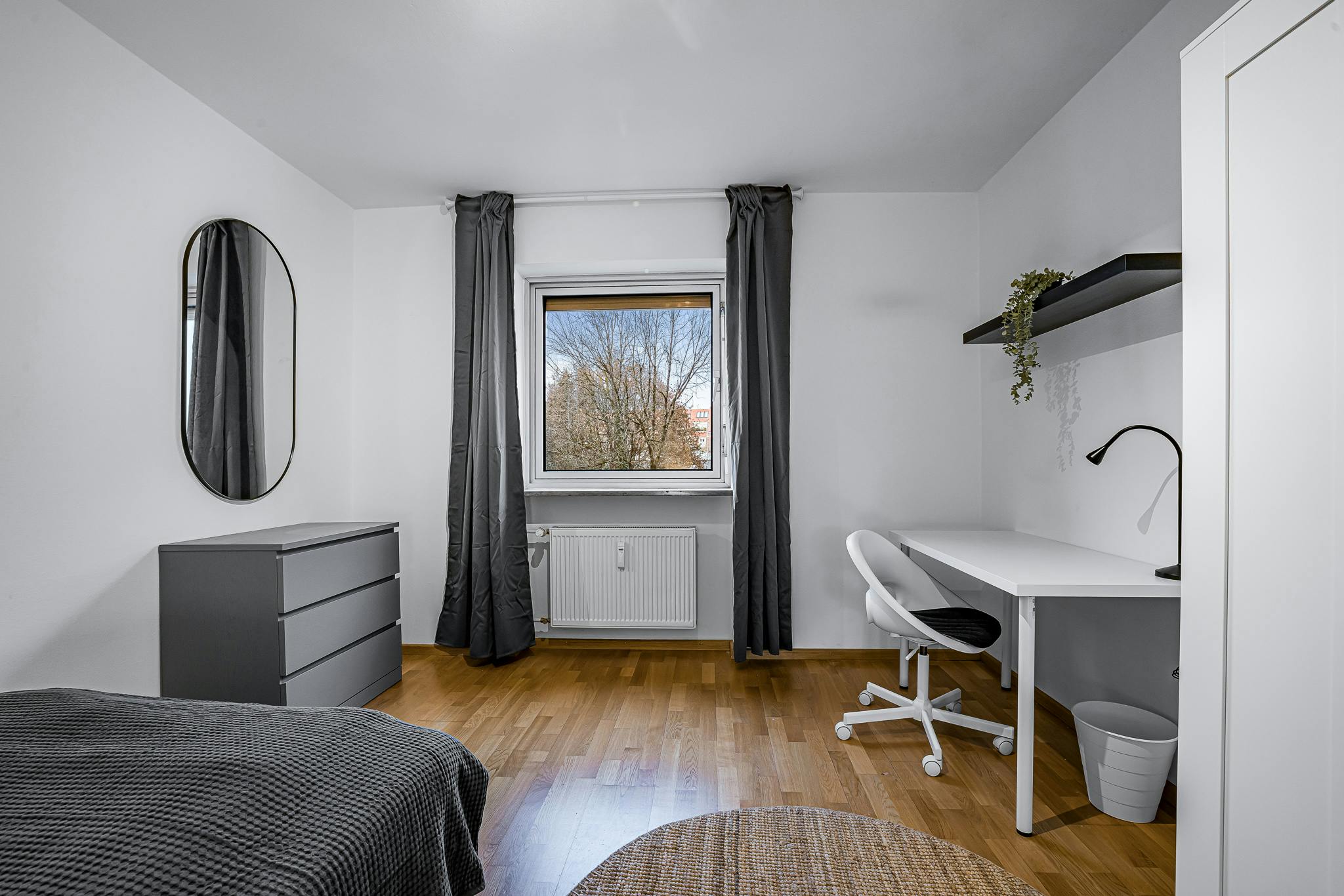 The room is furnished with a comfortable, large bed that promises restful nights. A practical, spacious desk provides ample space for focused work or study, while the stylish dresser adds extra storage and beautifully complements the wardrobe.