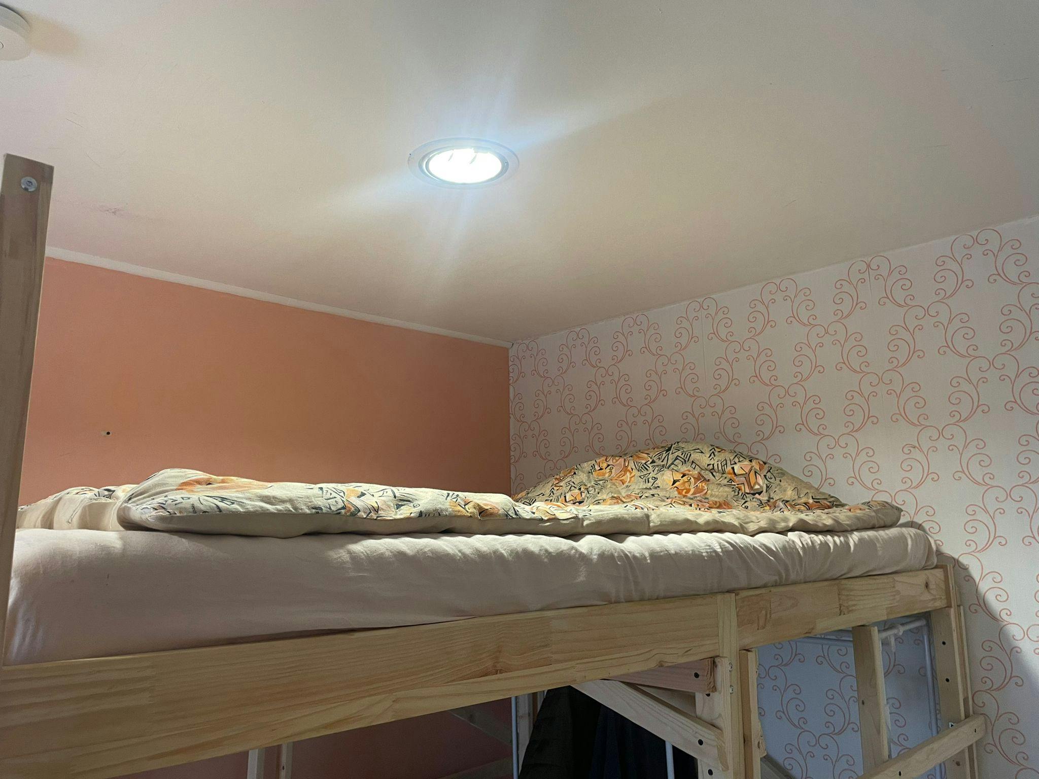 - Das besonders breite Bett ist deshalb über dem Schreibtisch hoch (als Stockbett) angebracht.