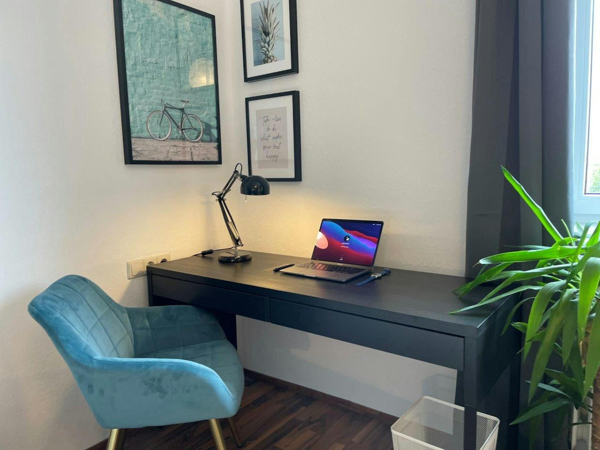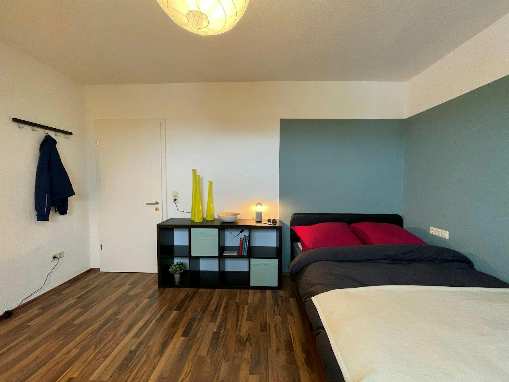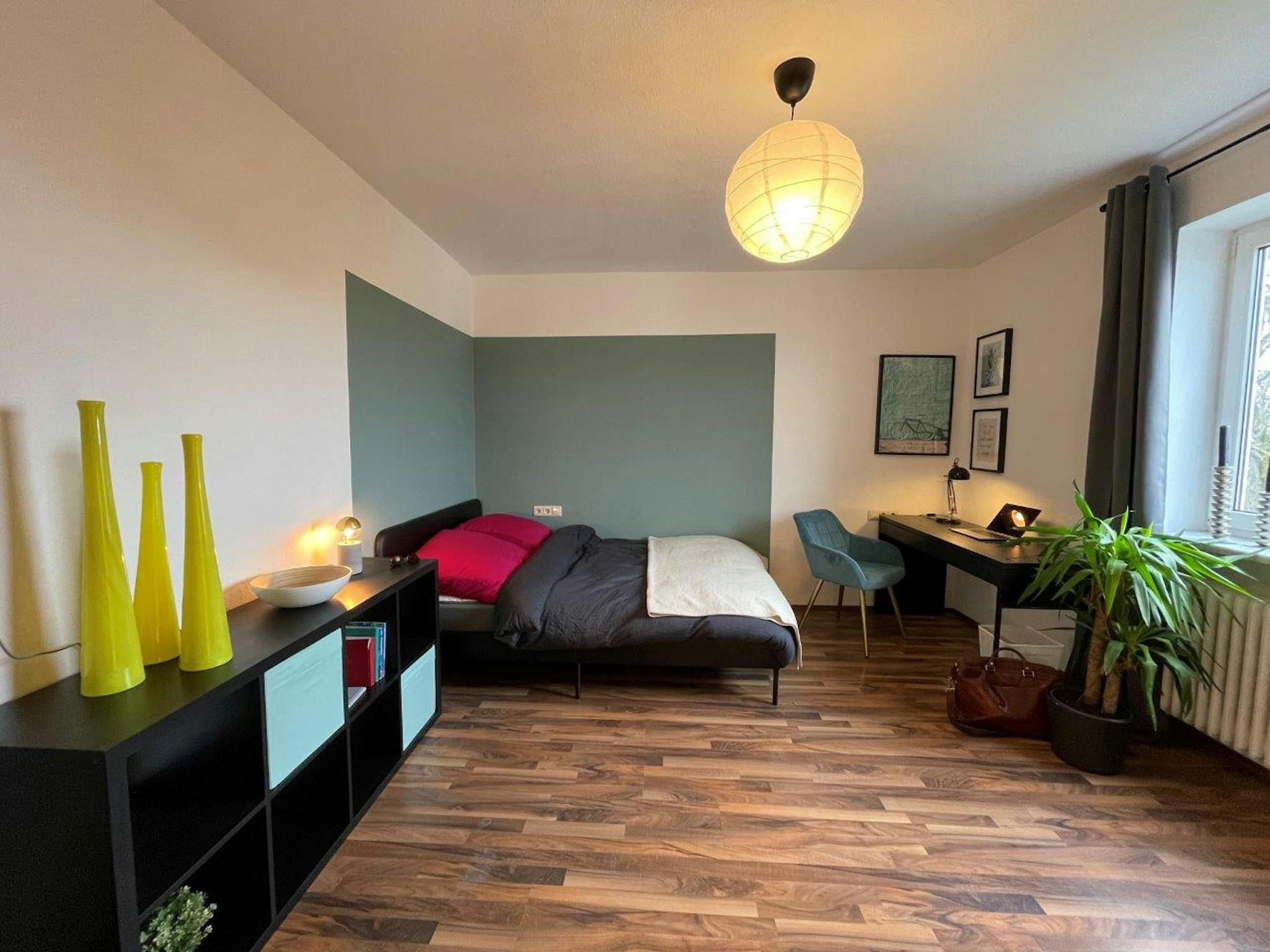 This modern bedroom offers a comfortable and cozy space. Enjoy the convenience of a fully furnished and equipped home, including a bed, wardrobe and a fully fitted kitchen featuring a hob, oven, fridge, microwave, and essential utensils. Relax with internet access, making this apartment perfect for mid-term stays.