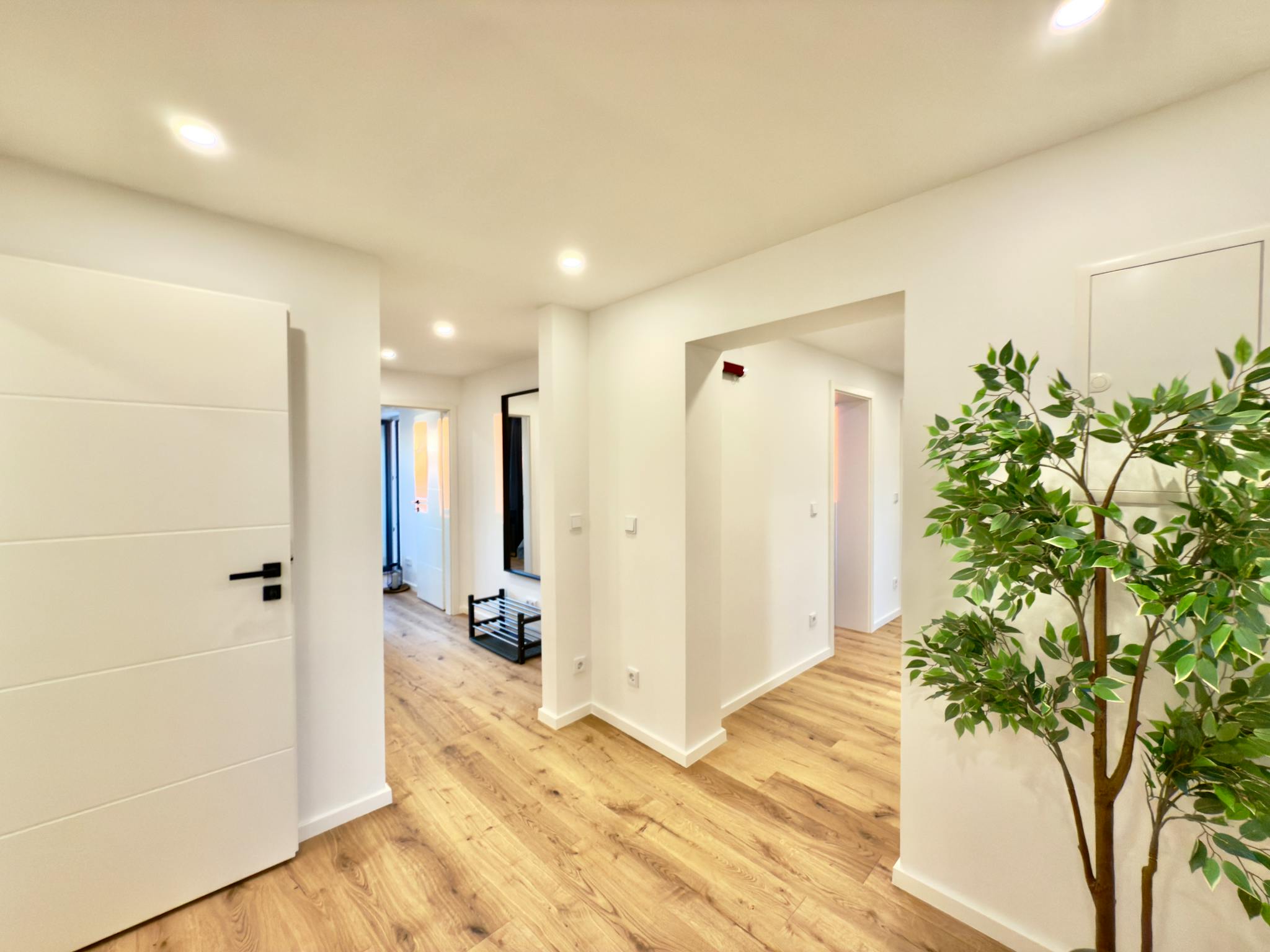 The generous hallway gives a very inviting impression and provides access to all rooms of the large apartment. The apartment also has a newly furnished bathroom, with a washbasin and LED mirror, a towel radiator, a shower, a washing machine, a dryer and a toilet.