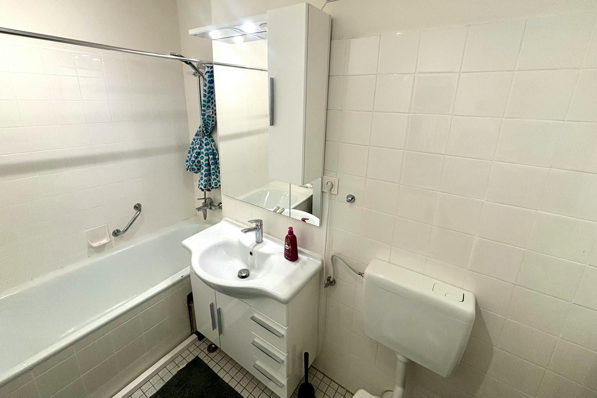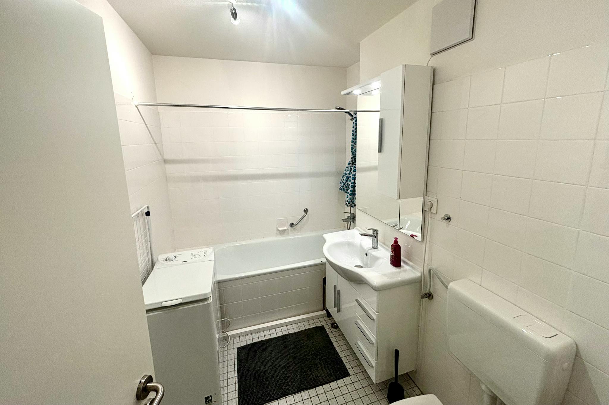 Das hell geflieste Bad verfügt über eine Badewanne mit Duschmöglichkeit, ein modernes Waschbecken mit Spiegelschrank, eine Toilette sowie eine Waschmaschine.