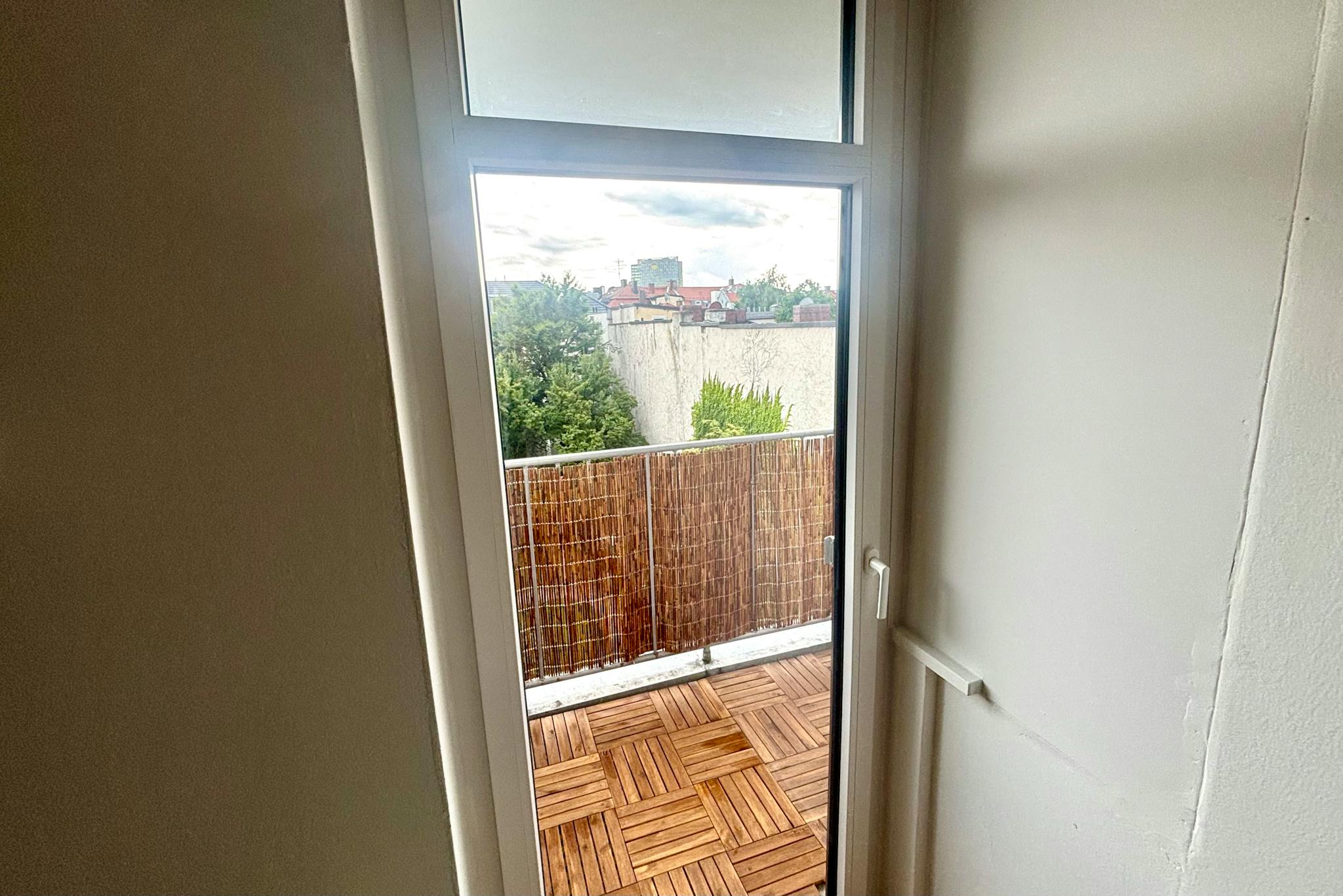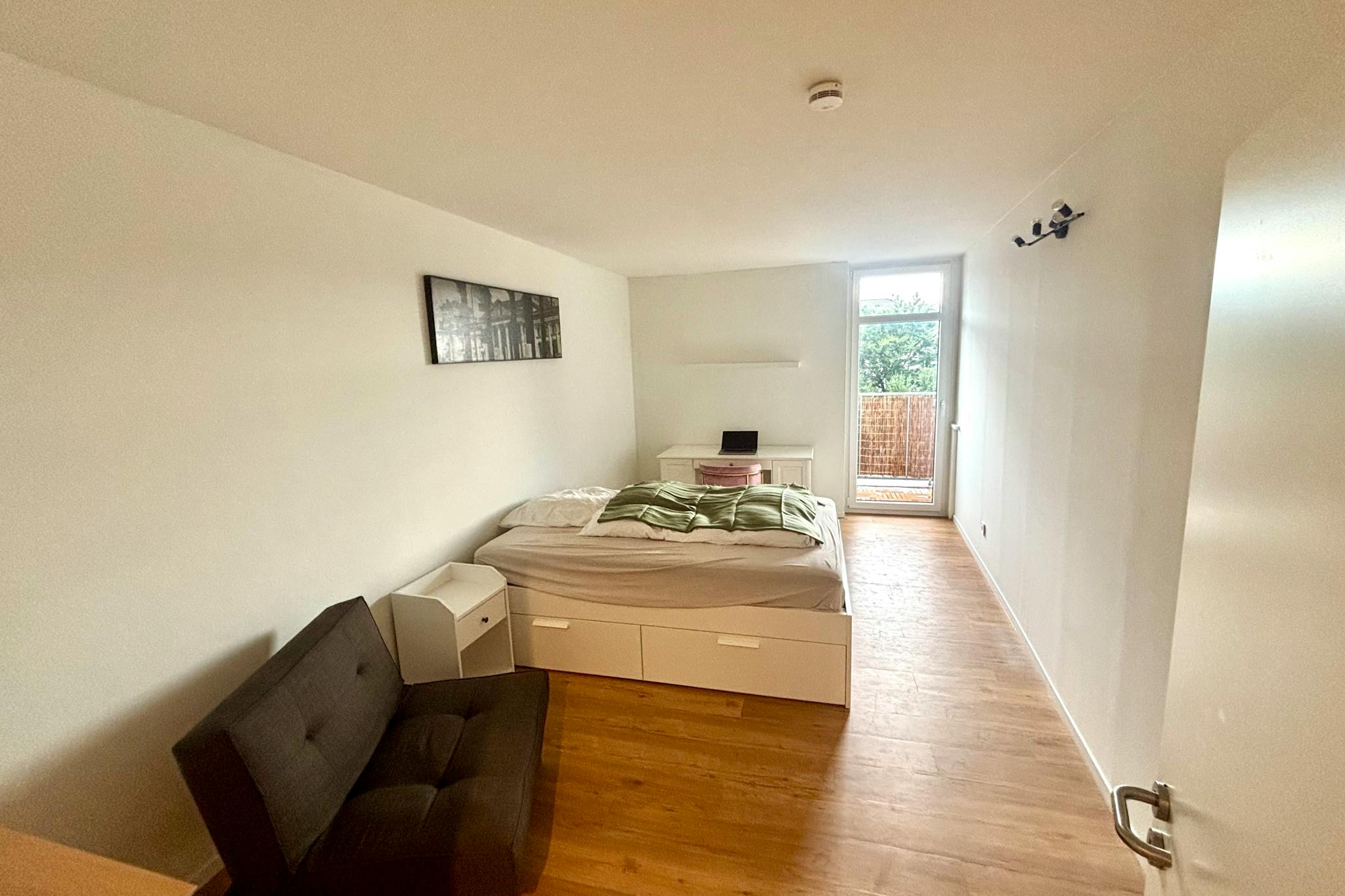 Der offene Wohnbereich bietet ein komfortables Doppelbett mit (hidden)zügigem Stauraum darunter, eine ausziehbare Schlafcouch sowie einen Schreibtisch mit gemütlichem Samtstuhl – perfekt für Arbeit oder kreative Stunden. Stilvolle Böden sorgen für eine moderne, wohnliche Atmosphäre. Vom Wohnbereich aus gelangt man direkt auf den privaten Balkon mit Blick ins Grüne, der zum Entspannen einlädt.