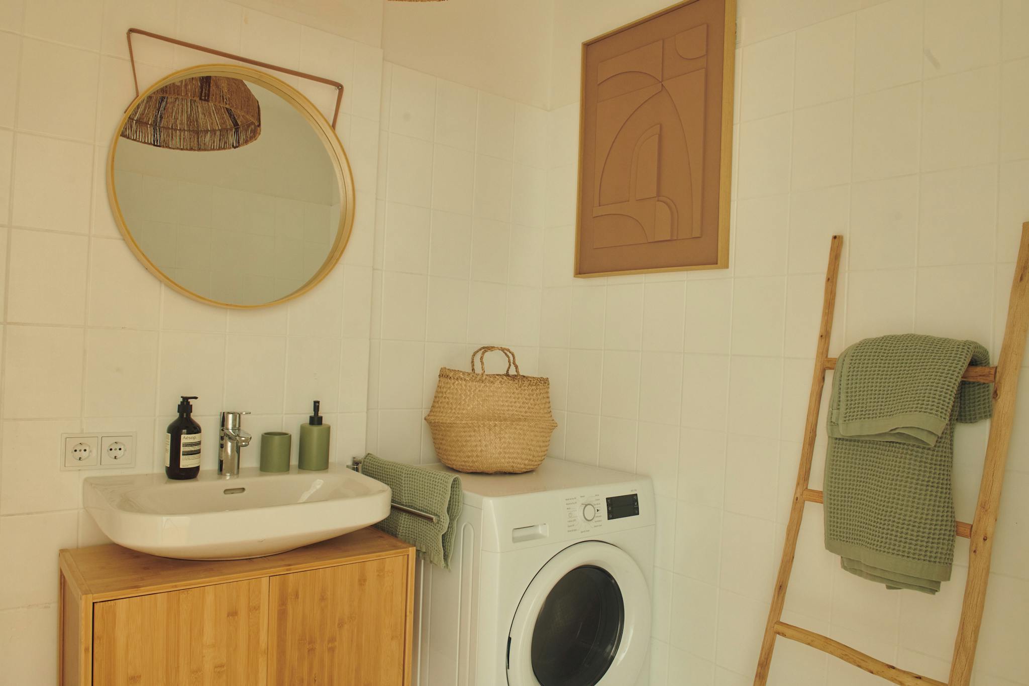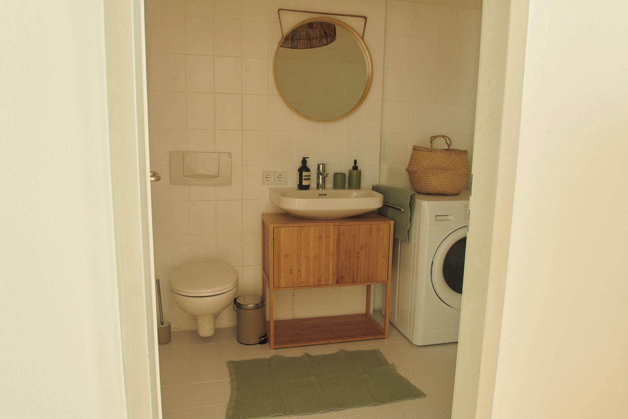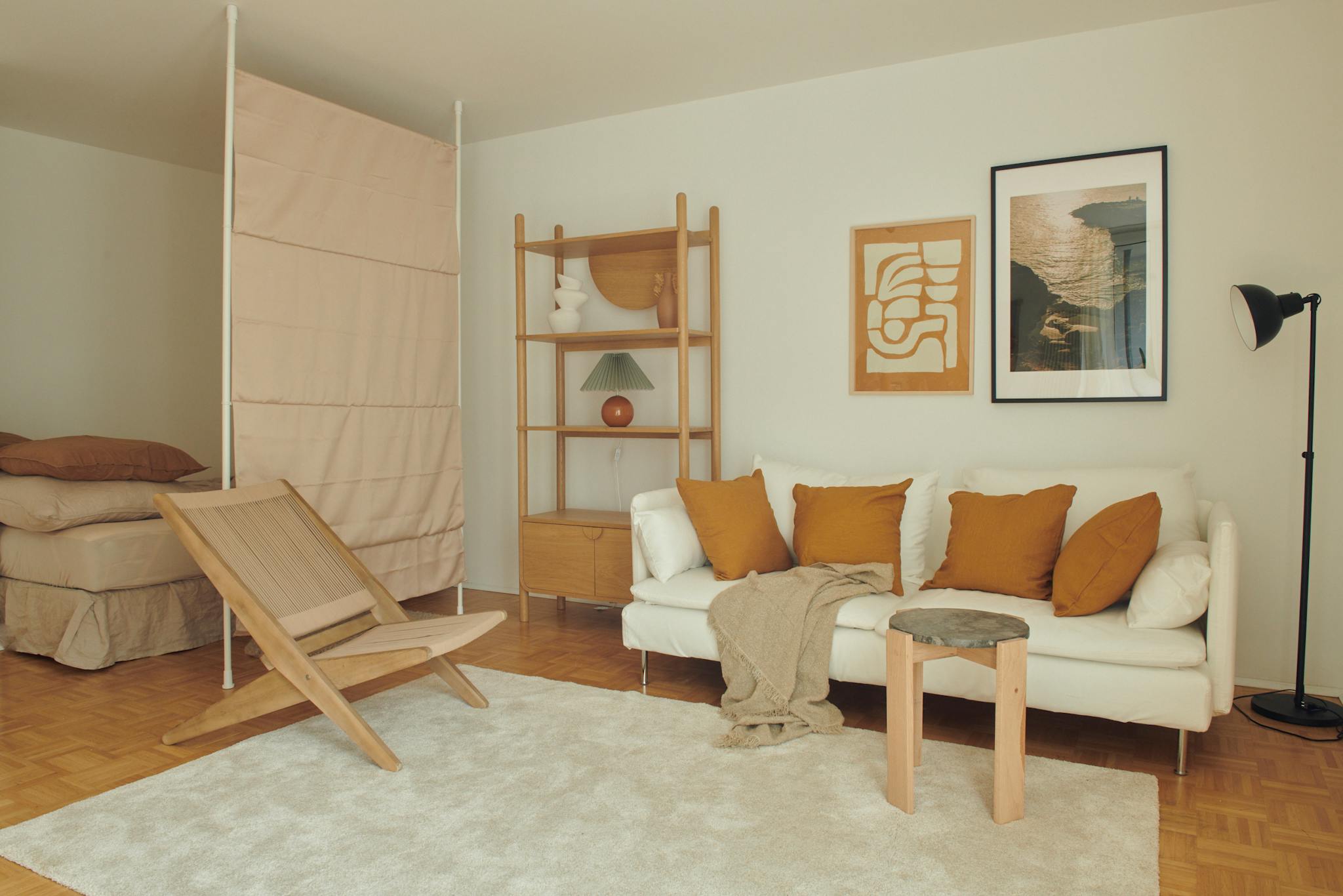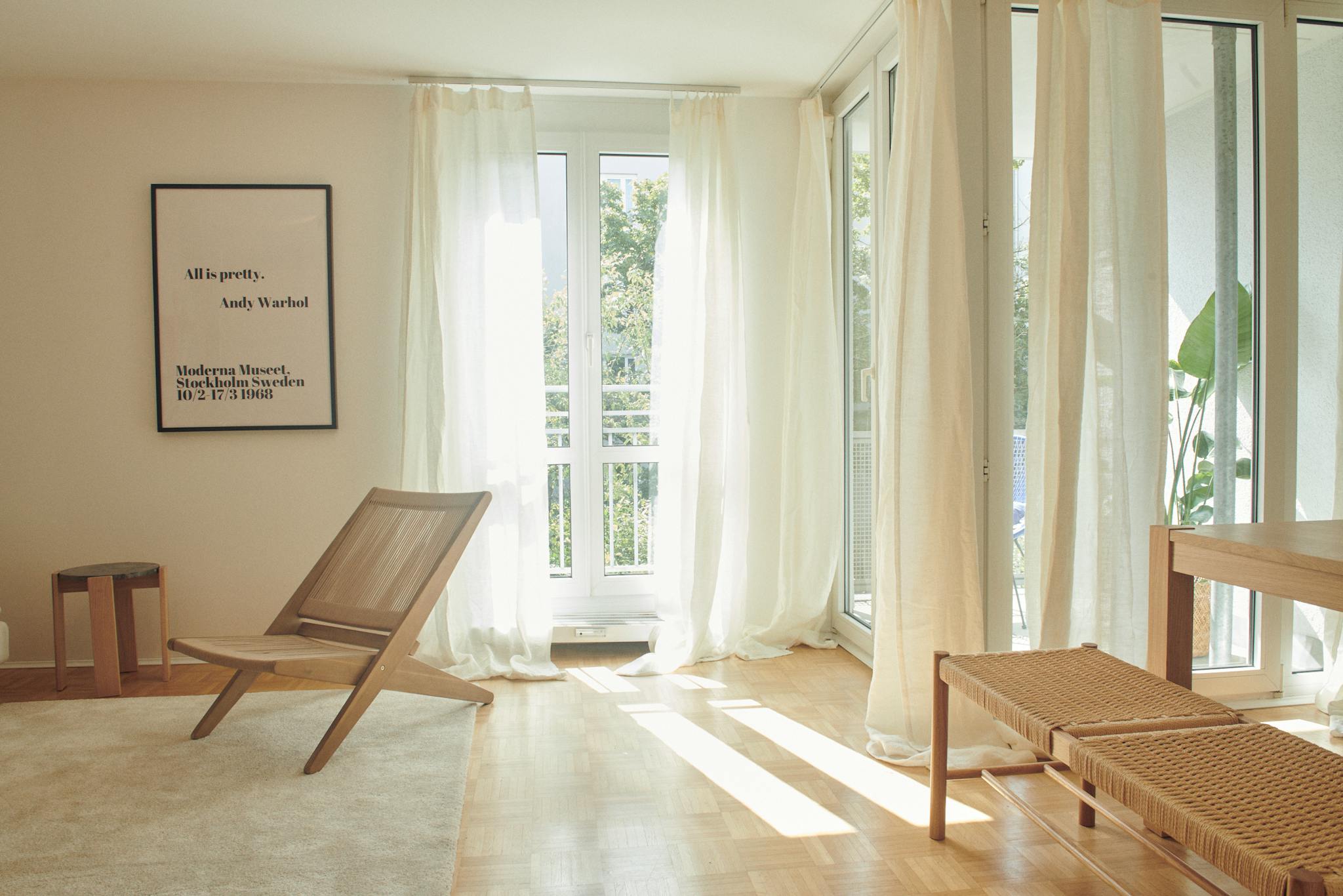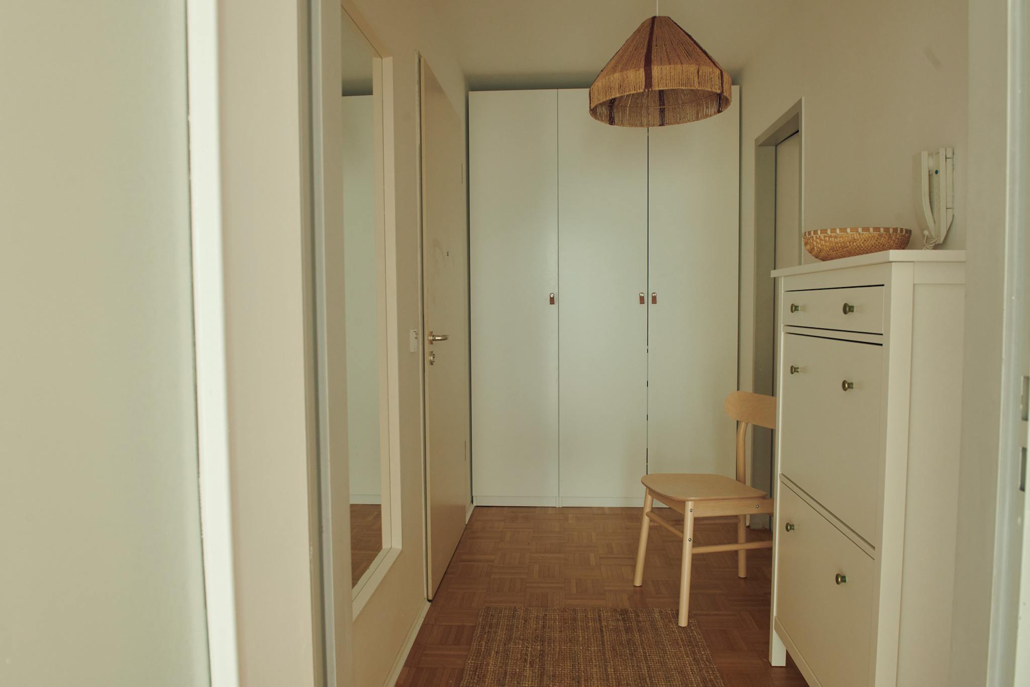 Materials such as linen, light wood, leather handles, and plenty of white combined with subtle colors refine the look. Unique framed photographs and artworks give the apartment a personal and distinctive touch. You immediately feel at home — the apartment radiates a positive calm and sense of harmony.