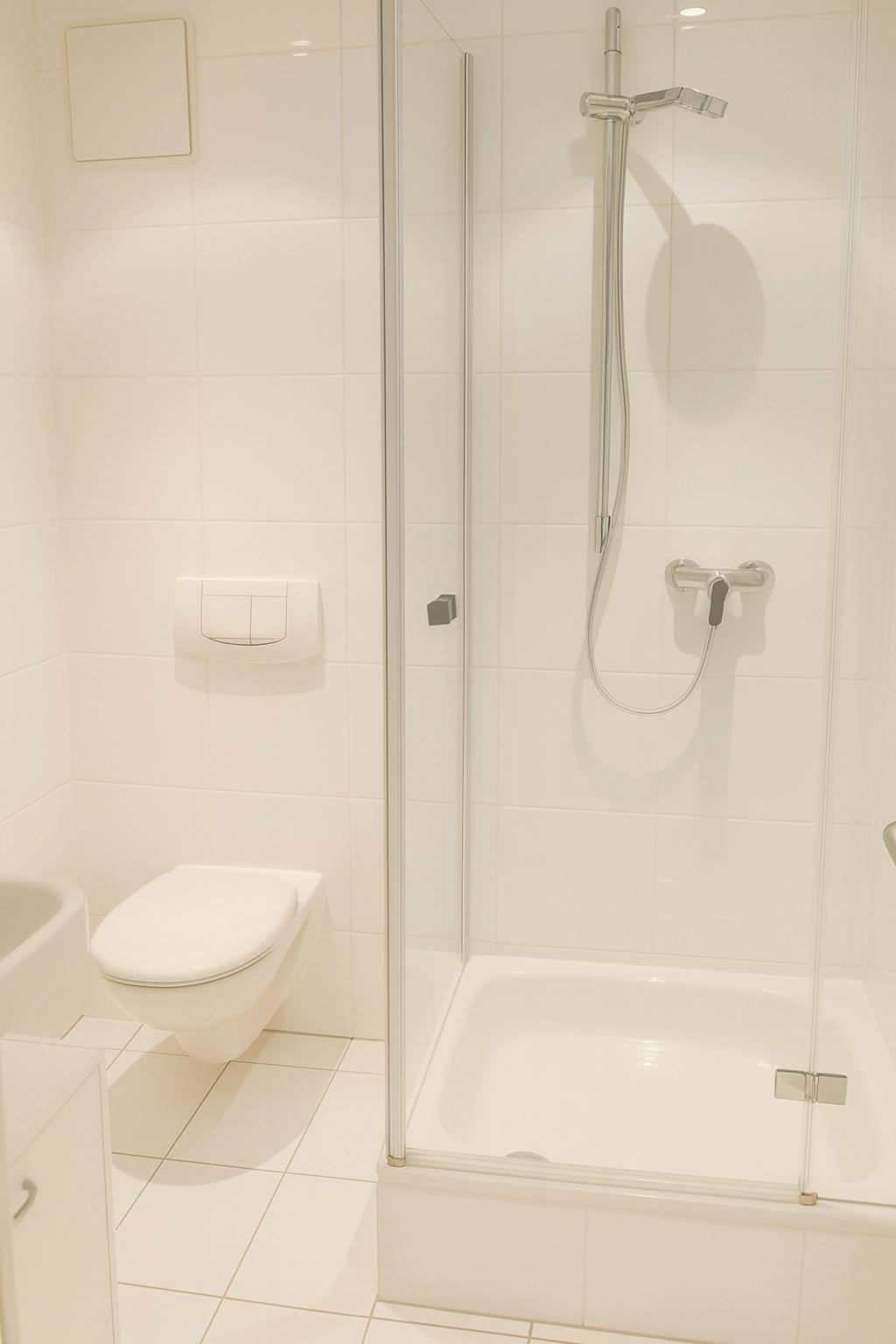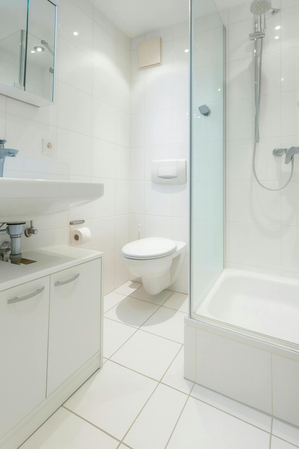 The modern bathroom is fully tiled in white and fitted with a washbasin with vanity unit, shower, and toilet, all in well-maintained condition.