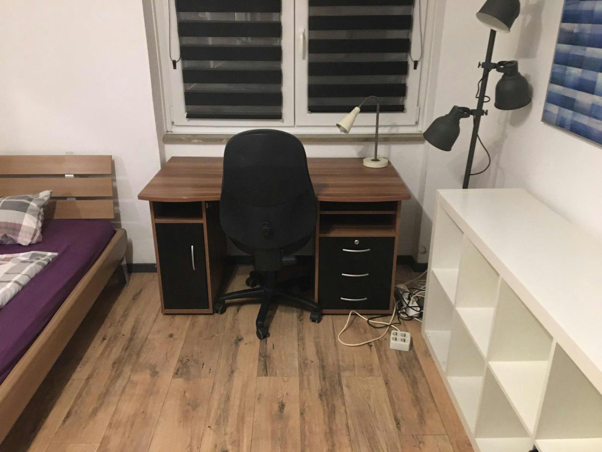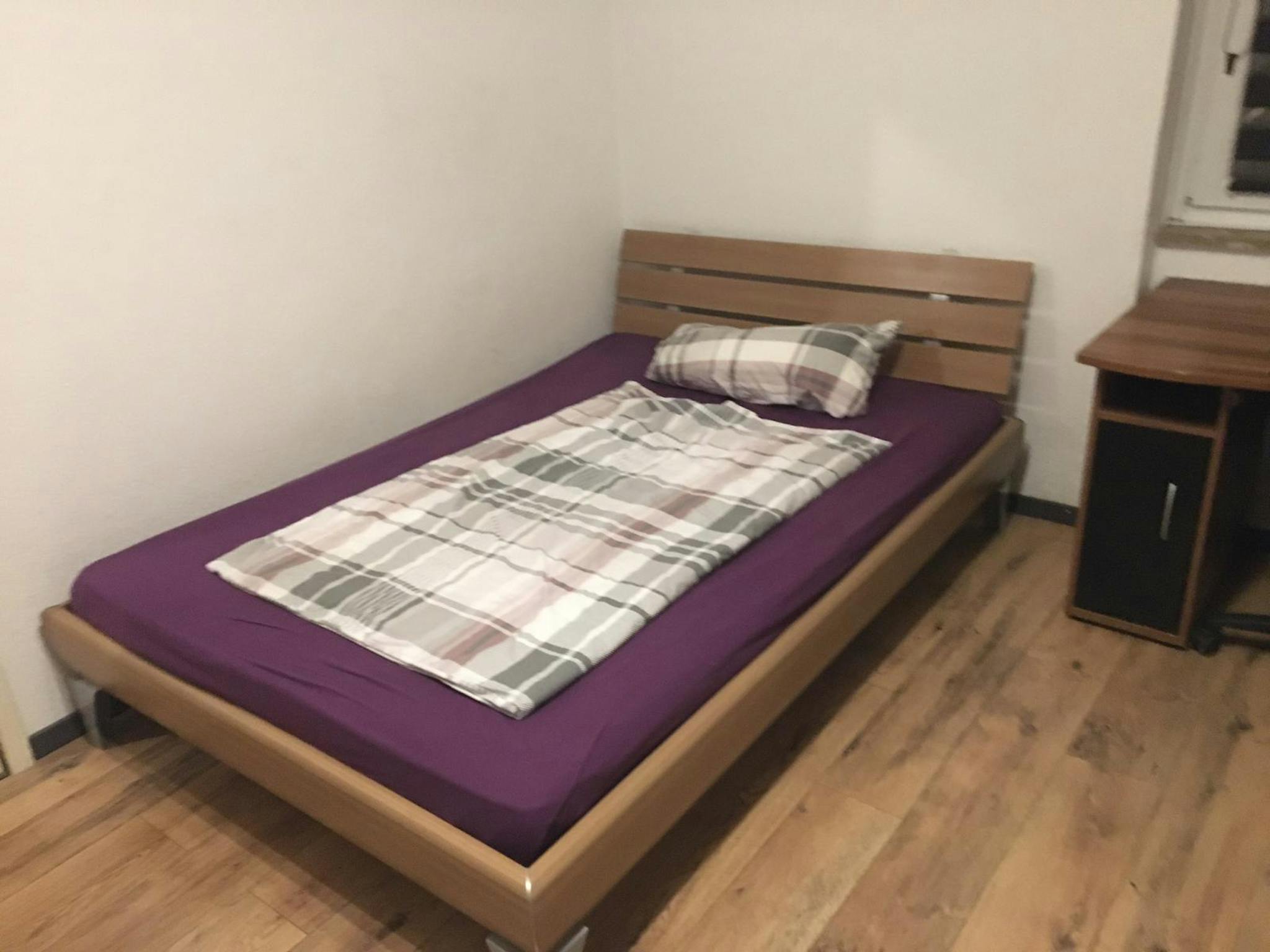 Es ist praktisch eingerichtet : Großes Bett (1,40m) , Schreibtisch, Kleiderschrank, Kommode, Regal