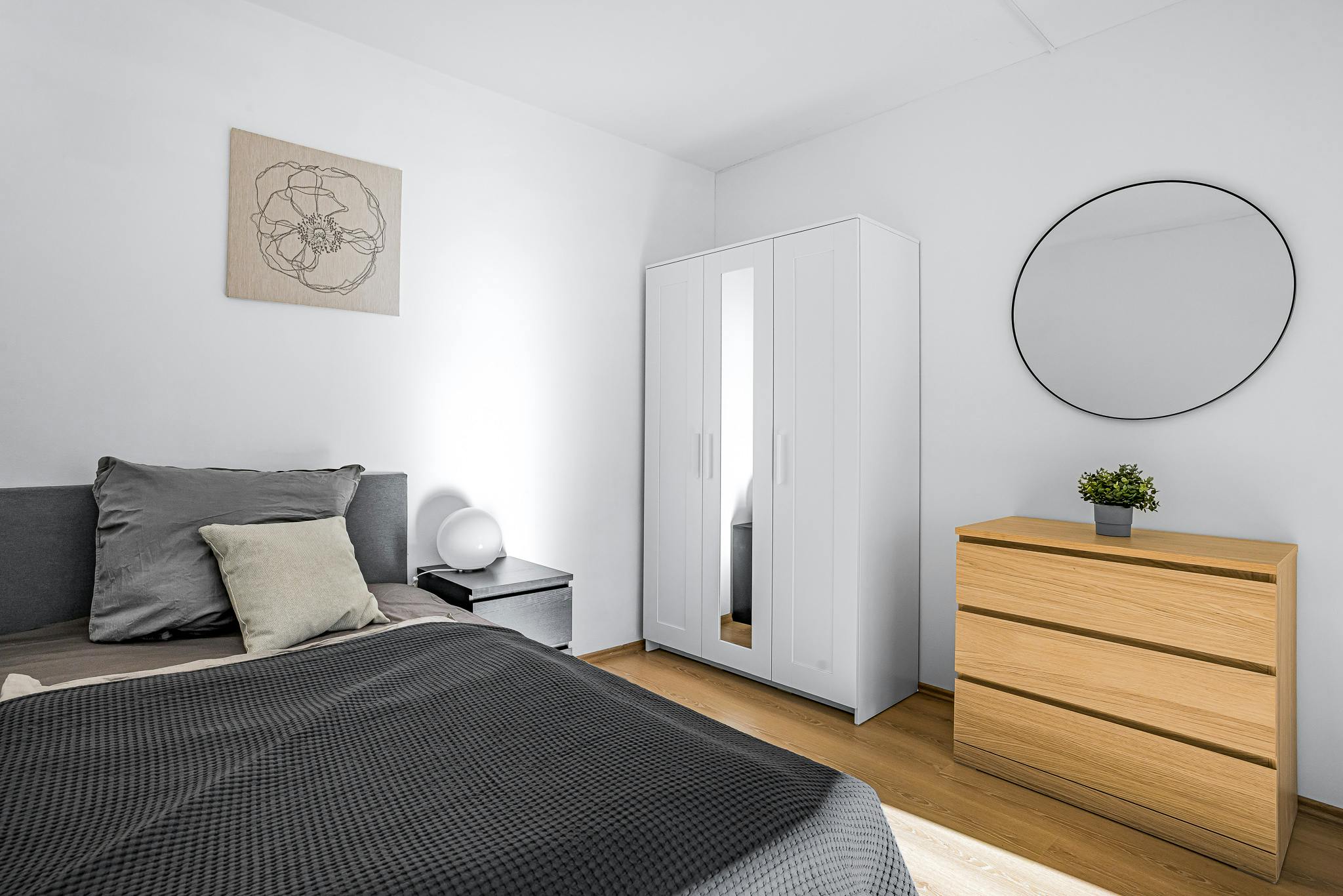 Your room offers approximately 15 square meters of generous space, flooded with natural light from two large windows. It comes furnished with a comfortable 140x200 cm bed, a practical desk, and a stylish dresser, providing ample storage alongside the wardrobe.