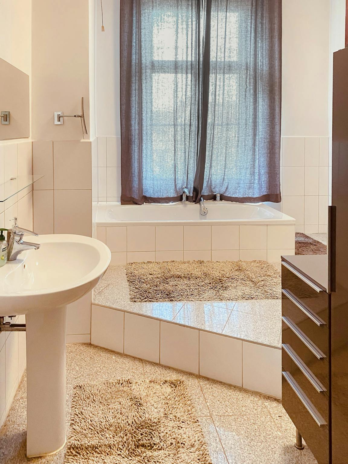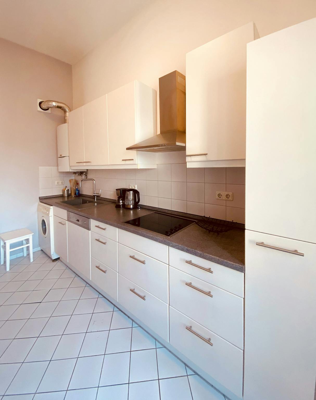 The shared spaces include a fully equipped kitchen with refrigerator, cookware, dishwasher, washing machine, and dryer, and one or two spacious bathrooms. Utilities (gas, water, electricity, heating) included. No extra charges except GEZ (media tax)
