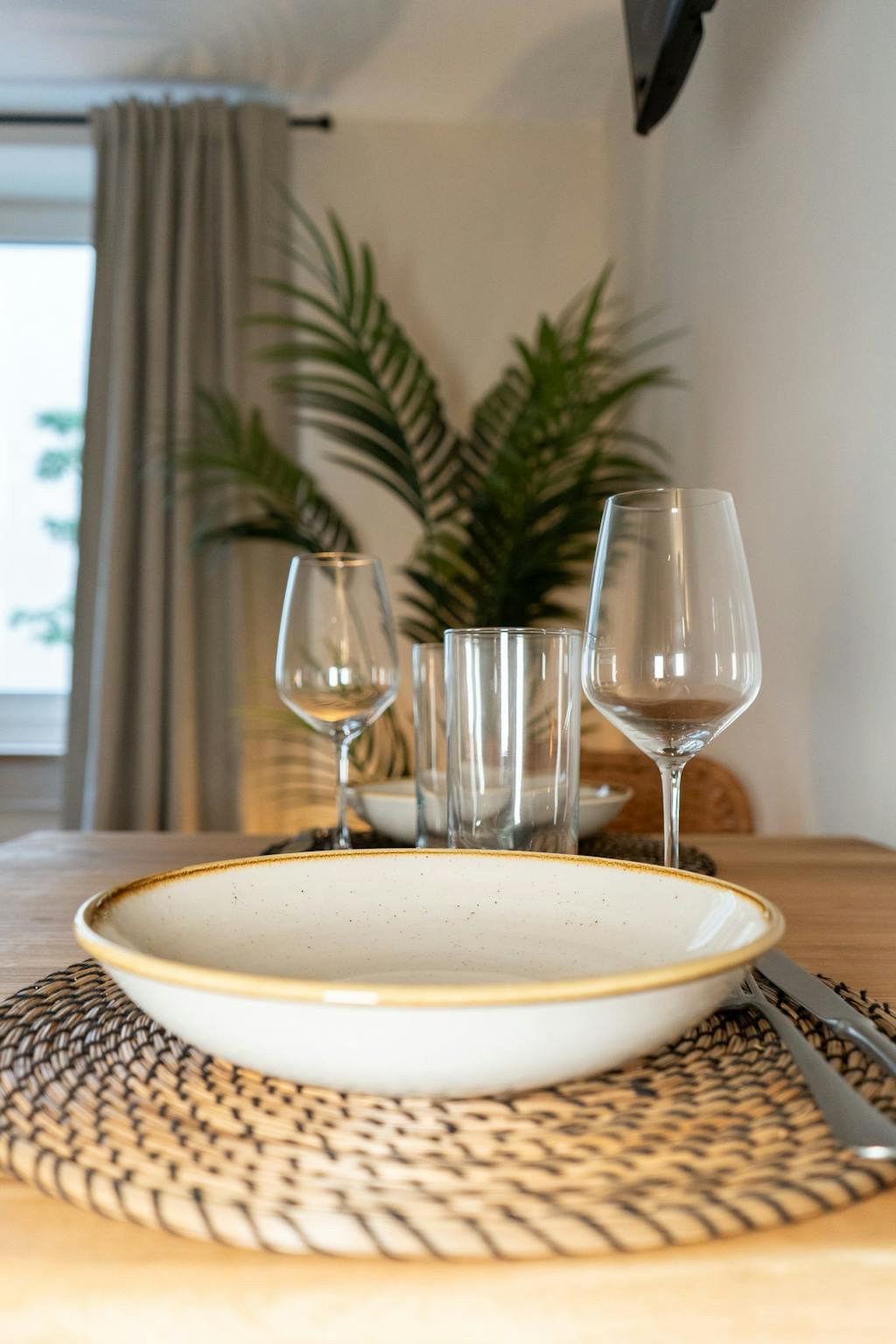 * kitchen essentials such as plates, glasses, cups, cutlery, and cooking utensils, all provided for your comfort and convenience;