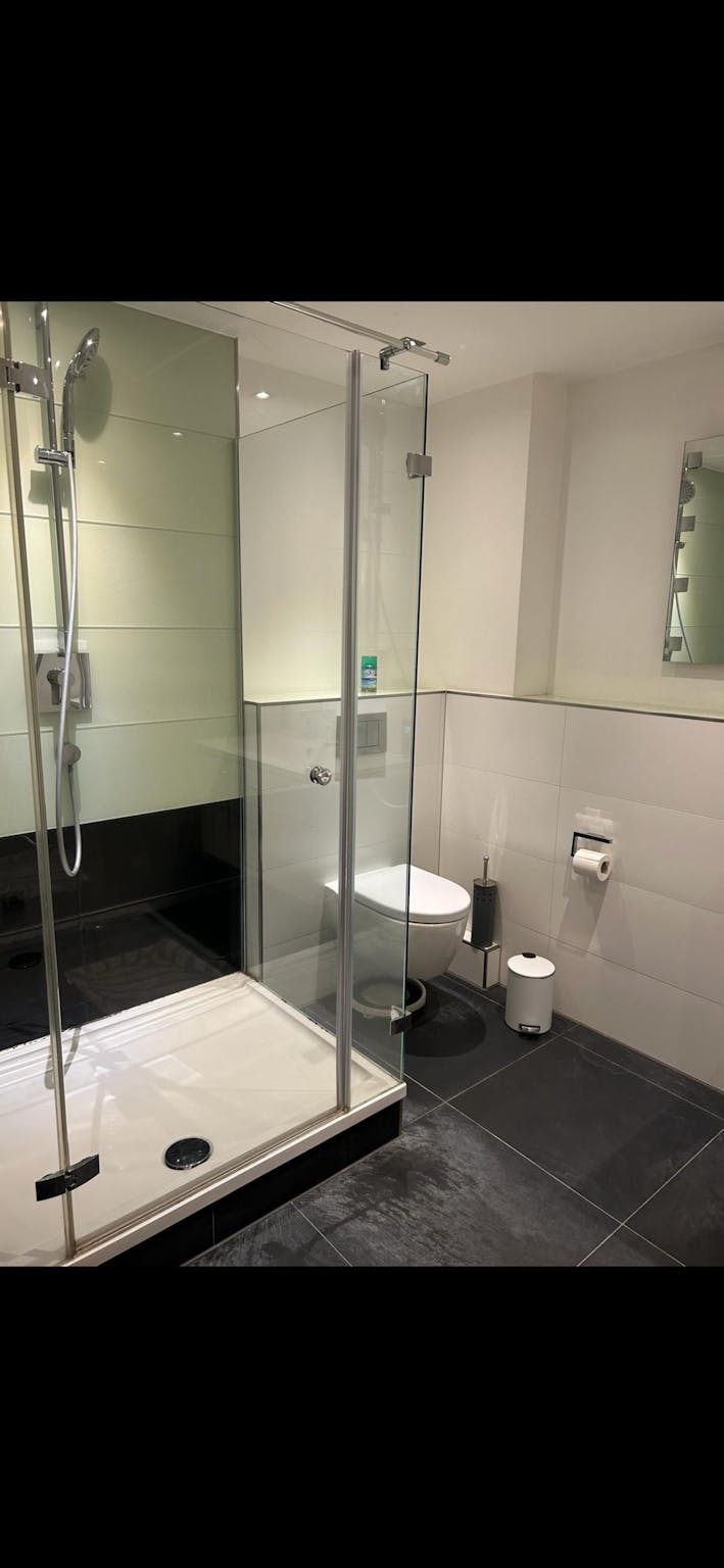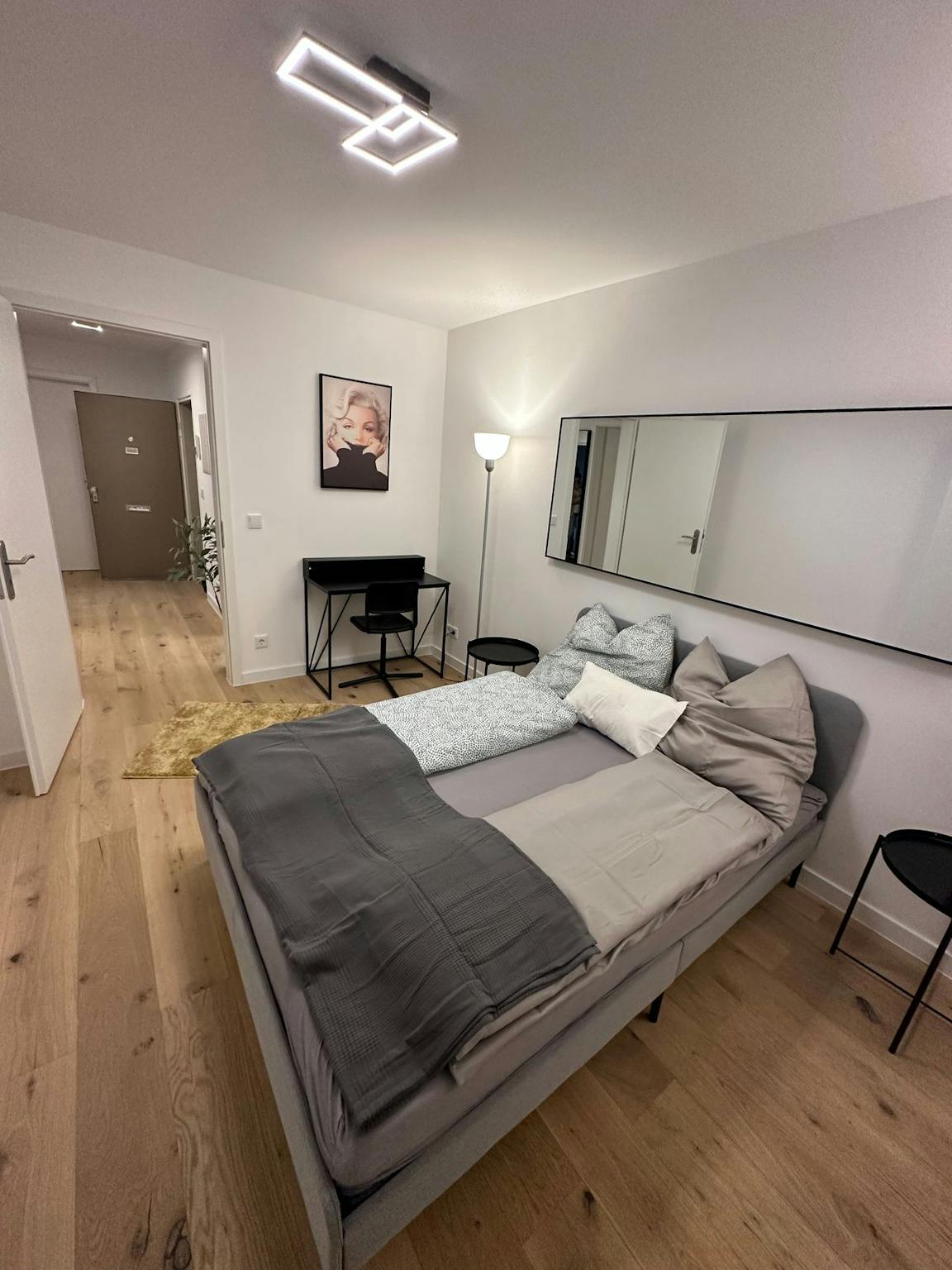 The apartment offers a bright and modern living space with a comfortable box spring bed, a dedicated workspace, and a high-quality dining area. The layout is ideal for professionals or couples looking for a well-connected and elegant home in Munich.